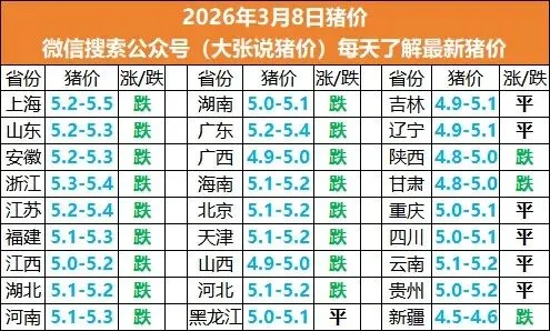 跌破成本线!3月8日猪价再探底,多地跌破5元/斤 养羊网 2026-03-07 跌破成本线!3月8日猪价再探底,多地跌破5元/斤 养羊网 2026-03-07 上一篇:2026年3月7日各地鸡蛋价格 下一篇:2026年3月07日全国各地鸡蛋价格行情 您可能还会对下面的文章感兴趣111: 相关文章 2025年4月13日全国各地生猪价格信息 猪粮比进入过度下跌一级预警区间,猪价被严重低估,或止跌回稳! 猪价反弹!2026.01.26-明日猪价 西班牙国民超市M的鸡蛋价格又上涨了