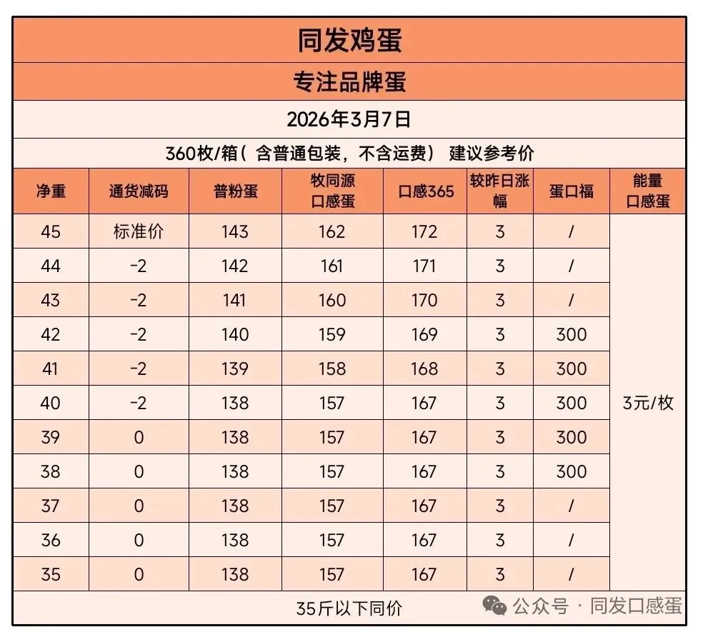 2026年3月7日贵港同发鸡蛋价格 养羊网 2026-03-07 2026年3月7日贵港同发鸡蛋价格以上价格为贵港同发鸡蛋平台公示的鸡蛋含包装成交结算价(上车价),仅供本平台渠道对接合作伙伴参考使用,不与其他任何报价做比较。 养羊网 2026-03-07 上一篇:2026年3月7日 湖北文燊蛋业鸡蛋价格 下一篇:2026年3月7日重庆鸡蛋收购参考价格 您可能还会对下面的文章感兴趣111: 相关文章 【明日猪价】2026.3.5全国猪价! 《江村经济》是一部由费孝通所著的社会学著作 近期价格更新!!! ?⑤?的无抗鸡蛋又到了哈哈