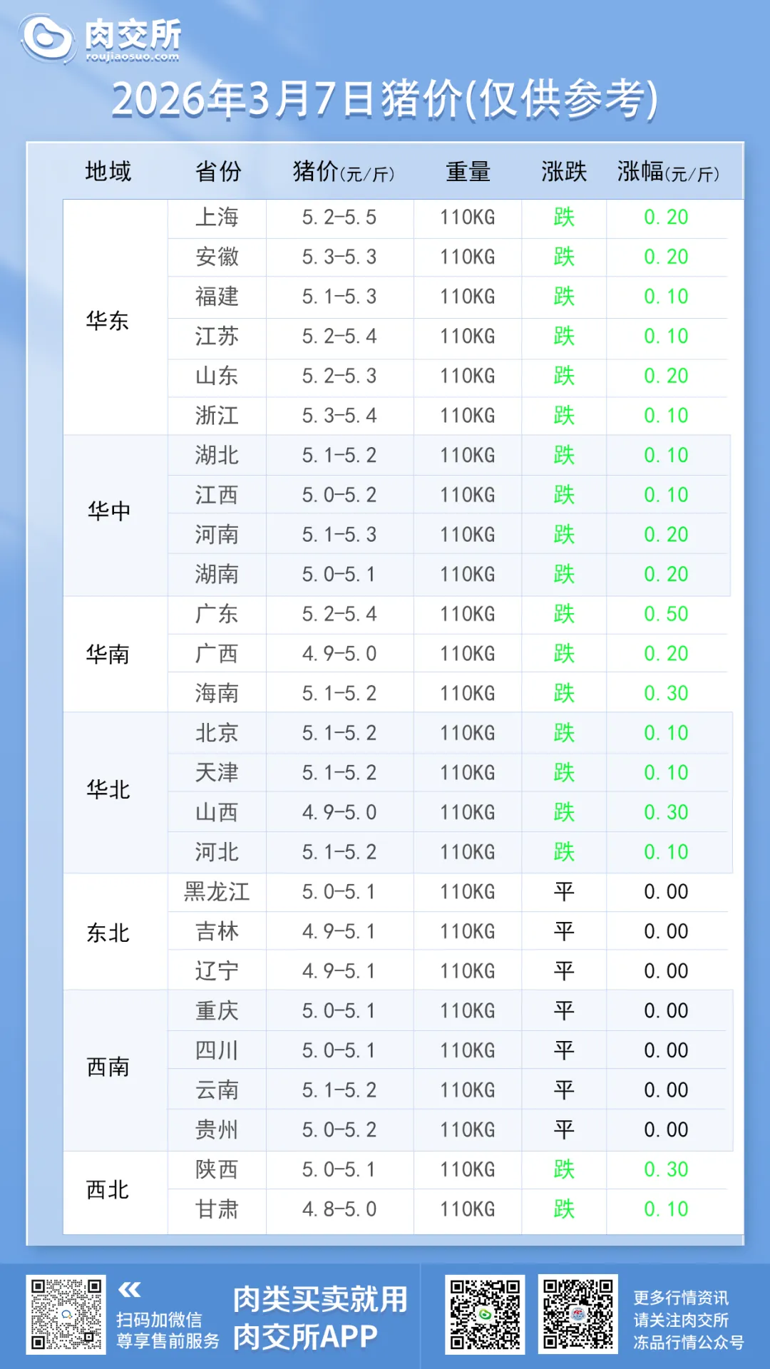 广东暴跌 0.5 元 / 斤,海南、山西、陕西跌 0.3 元 / 斤,上海、安徽、山东、河南、湖南、广西跌 0.2 元 / 斤; - 小幅跟跌