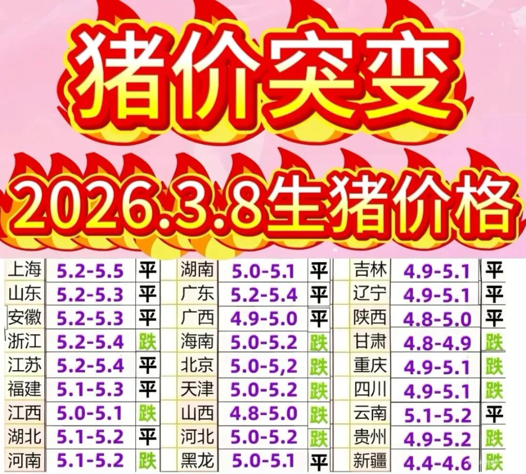 猪价突变!2026年3月8日生猪价格 养羊网 2026-03-07 猪价突变!2026年3月8日生猪价格 养羊网 2026-03-07 上一篇:【猪价预测】3月9-3月12 猪价预测 下一篇:【猪价预测】3月9日至3月11日!全国猪价! 您可能还会对下面的文章感兴趣111: 相关文章 2026.1.26全国鸡蛋价格,仅供参考 2026年2月10号鸡蛋价格:白褐稳定,粉壳突落. 求回答 黑山羊不养了2O一斤