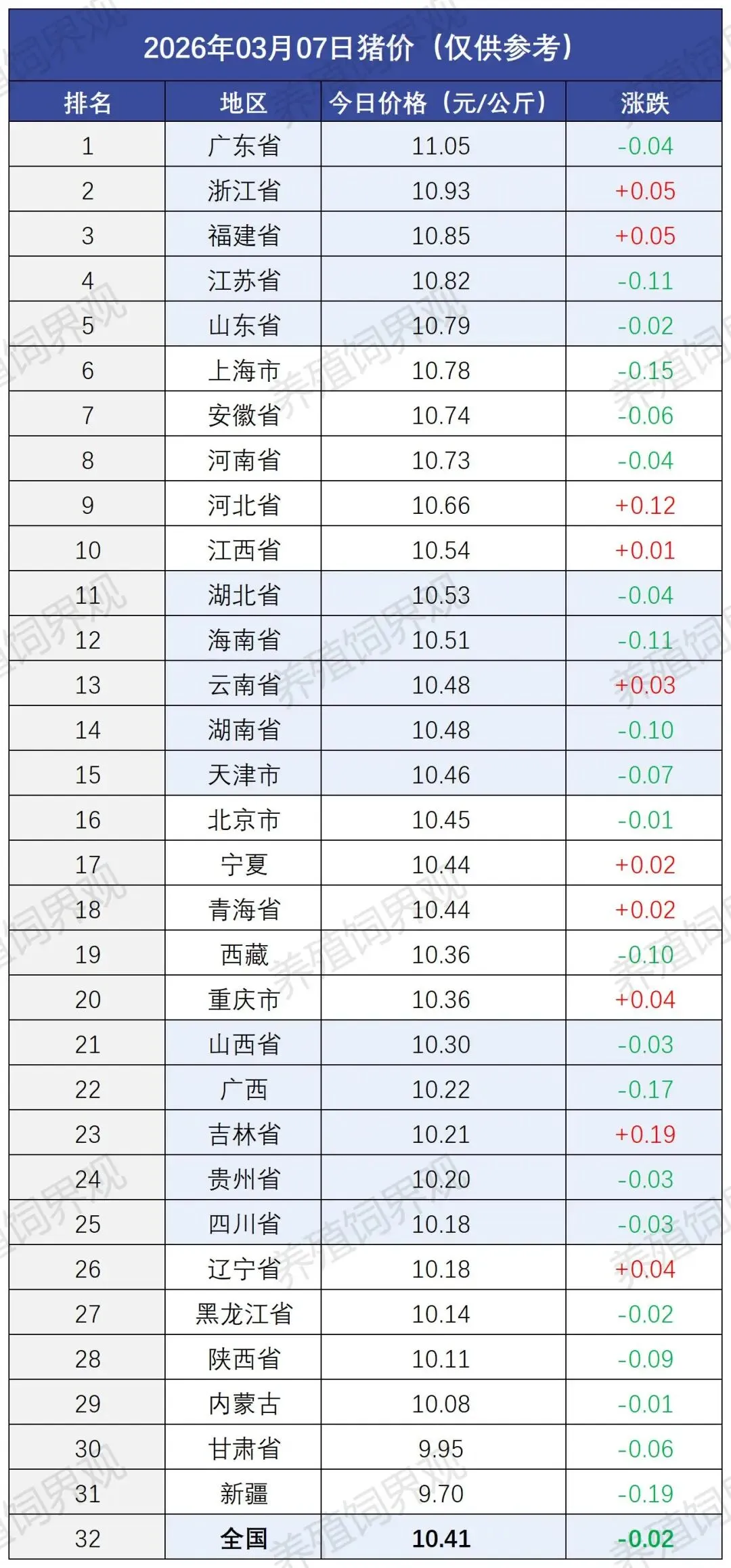 目前全国最高价为广东省,价格为11.05元/公斤,较昨日下跌0.04元/公斤;全国最低价为新疆,价格为9.70元/公斤,较昨日下跌0.19元/公斤。