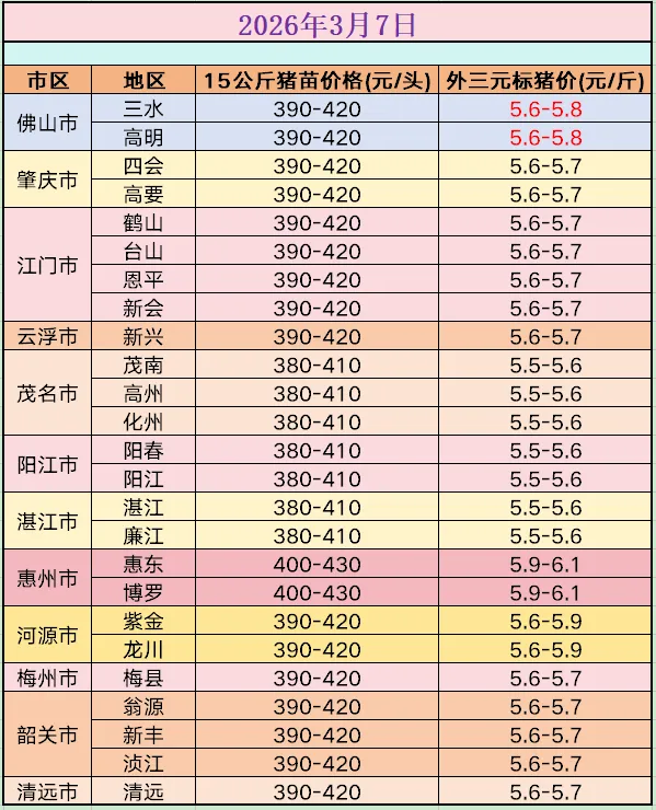 3月7日猪价速递 养羊网 2026-03-07 3月7日猪价速递广东猪苗全省报390~420元,毛猪报5.6~6.1元,除佛山微升外,其它各地价格稳定。(行情仅供参考) 养羊网 2026-03-07 上一篇:【东北猪价】 2026. 3. 猪价突变! 下一篇:猪价180°大变、僵持偏弱! 您可能还会对下面的文章感兴趣111: 相关文章 【减脂期测评】即食鸡蛋 部分测评 黑榜 乡村日记|村里散养的羊咩咩 11月2日全国猪价北跌南稳! 近期价格更新!!!