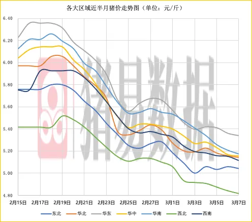 东北、华中、西南、华北、华东、华南、西北地区猪价呈现下跌,生猪平均价格呈现微跌。