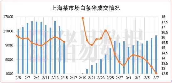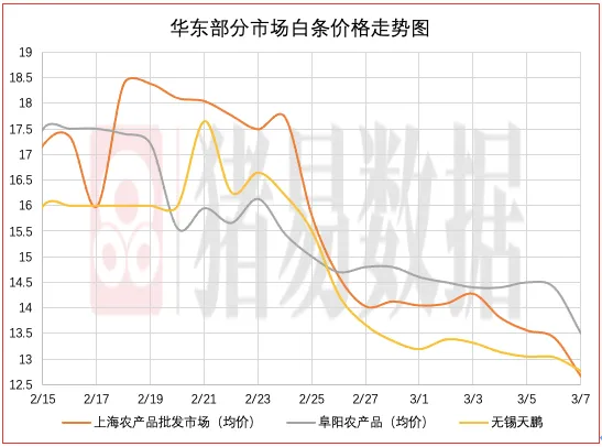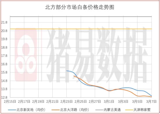 从今日北京、上海消费城市批发市场白条价格走势来看,北京、上海批发市场白条成交价格呈现稳中伴跌,北京市场开磅价稳定为主,市场成交均价表现偏差,市场走货速度表现偏差;上海市场价格呈现下跌,部分市场成交价参考12.57-12.65元/公斤,到货量增加,市场交易情绪表现偏差,市场成交均价表现较差。