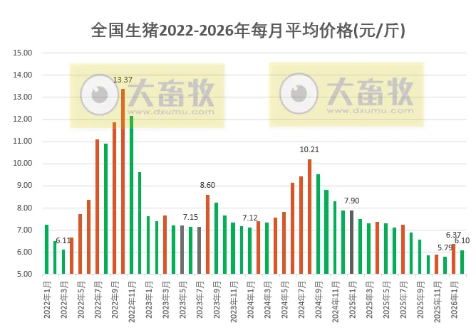 根据每日猪价计算,2026年2月高位猪价平均值为6.21元/斤,低位猪价平均值为5.98元/斤,