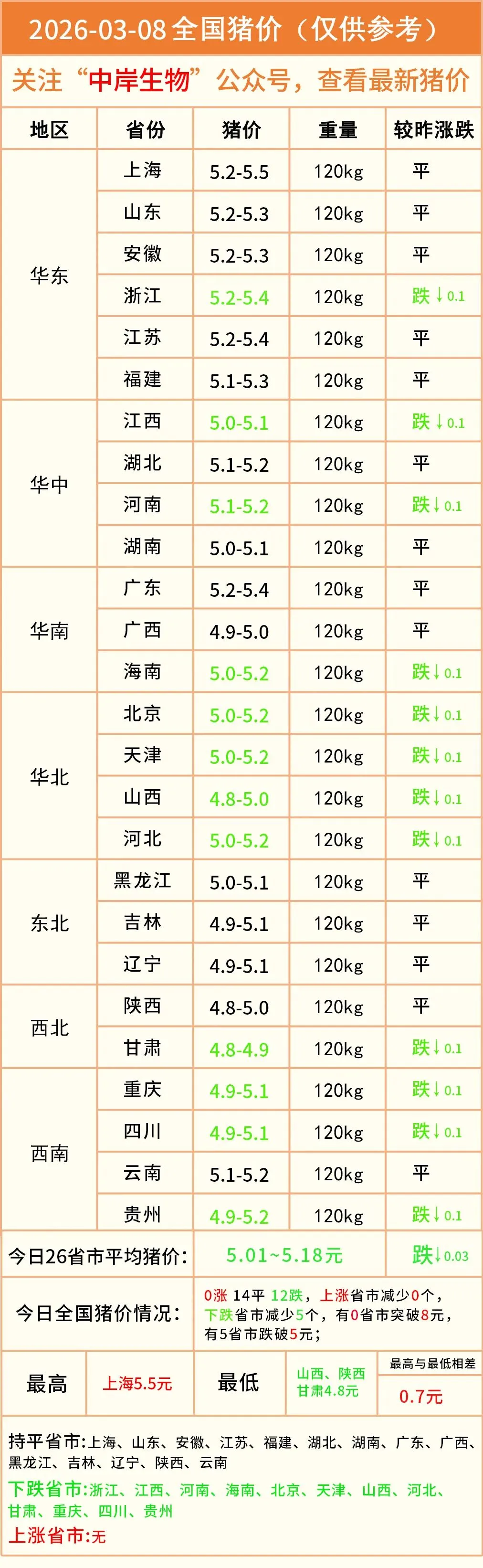 明日猪价|2026-03-08全国最新猪价(猪价已更新!) 养羊网 2026-03-07 明日猪价|2026-03-08全国最新猪价(猪价已更新!)营销中心丨0731-83806009技术服务丨0731-83806019 养羊网 2026-03-07 上一篇:2026.3.8 --猪价 下一篇:明日猪价——2026年03月08全国生猪价格! 您可能还会对下面的文章感兴趣111: 相关文章 0元购!一代人有一代人的鸡蛋!!! 收藏!家庭农场的12个盈利点 2025年4月13日全国各地生猪价格信息 2026年1月29日鸡蛋价格行情参考