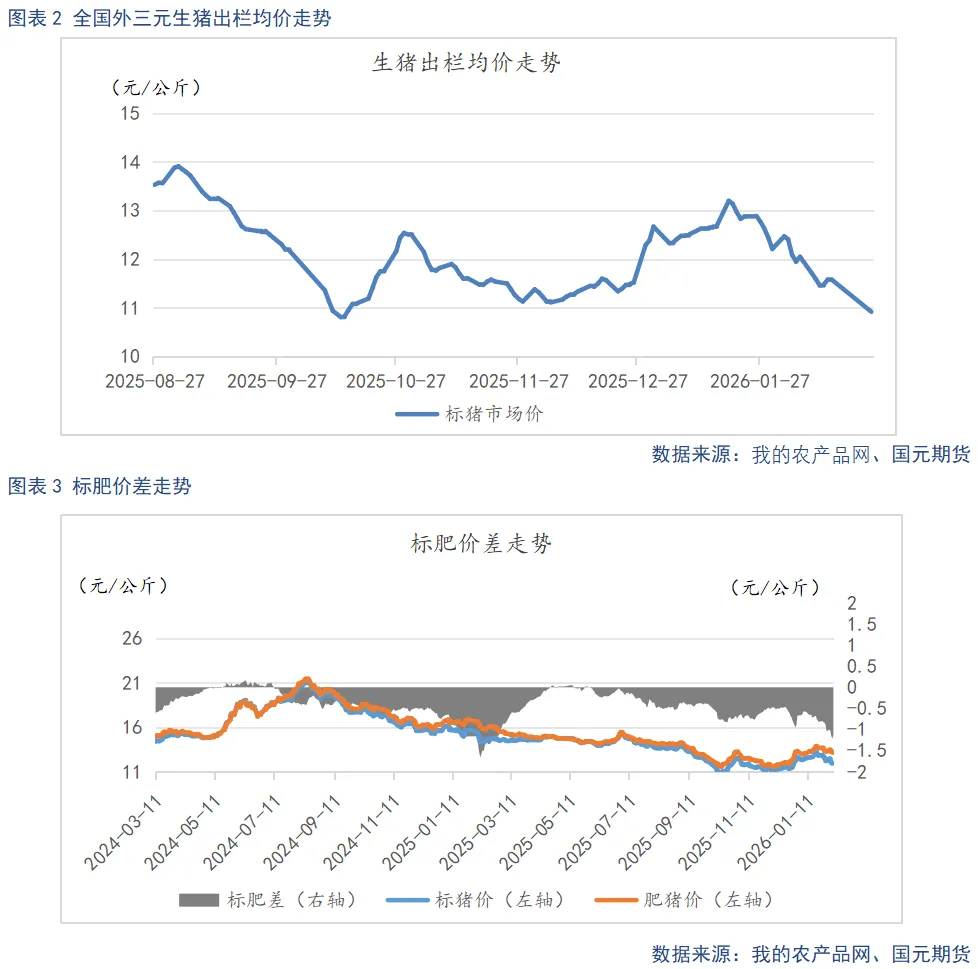 进入2月以来,生猪价格呈现单边下行态势。国元期货数据显示,截至2月24日,全国生猪出栏均价为10.92元/公斤,较上月末下跌1.29元/公斤。随着春节假期结束,养殖场陆续恢复正常出栏节奏,而终端消费同步走弱,市场供需失衡进一步加剧,猪价承压明显。标肥价差同步变化,2月24日标肥价差为-0.78元/公斤,较上月末缩窄0.26元/公斤。