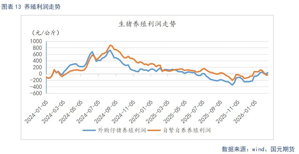 价格持续下行直接冲击养殖利润。截至2月20日,自繁自养养殖已亏损29.25元/头,较1月末下降125.52元/头,成本线附近的养殖户普遍面临实际亏损。相比之下,外购仔猪养殖仍有34.8元/头的利润,利润较1月末下降13元/头,盈利空间持续收窄。春节备货收尾后终端需求转弱,猪价承压回落,而饲料成本相对稳定,未能对冲猪价下跌带来的盈利压缩,养殖端的经营压力进一步加大。