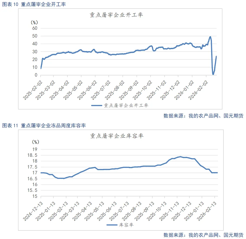 冻品库存方面,节前屠宰企业对后市行情预期不强,在节前旺季积极主动出库冻品,库容率持续下降。截至2月24日,重点屠宰企业冷冻肉库容率为17%,较上月末下降0.29%。节后需求低迷,冻品库存去化节奏放缓,虽未形成明显库存压力,但也难以对现货价格形成有效支撑。