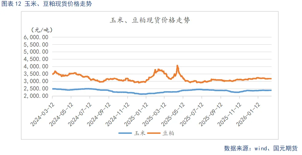 饲料原料价格呈现窄幅波动态势,养殖成本端相对稳定。截至2月24日,玉米现货均价为2375.29元/吨,较上月末微跌0.98元/吨;豆粕现货均价为3167.71元/吨,较上月末下跌29.43元/吨。玉米市场方面,基层售粮偏慢、优质干粮偏紧,叠加深加工与饲料企业节后集中复工补库,走势稳中偏强;豆粕市场则处于供需双淡格局,国内油厂陆续复工带动供应恢复,但下游养殖需求尚未全面复苏,采购以随用随买为主,价格缺乏上行动能,短期延续震荡整理。
