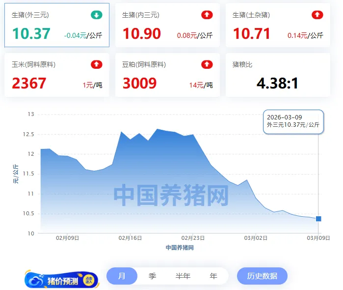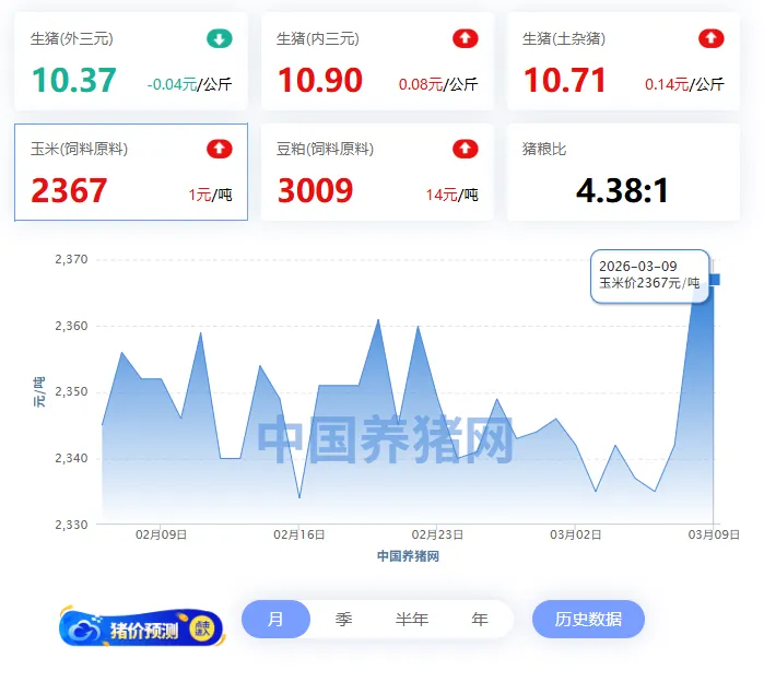 2026年03月09日-中国养猪网 全国玉米价格走势图及涨跌表