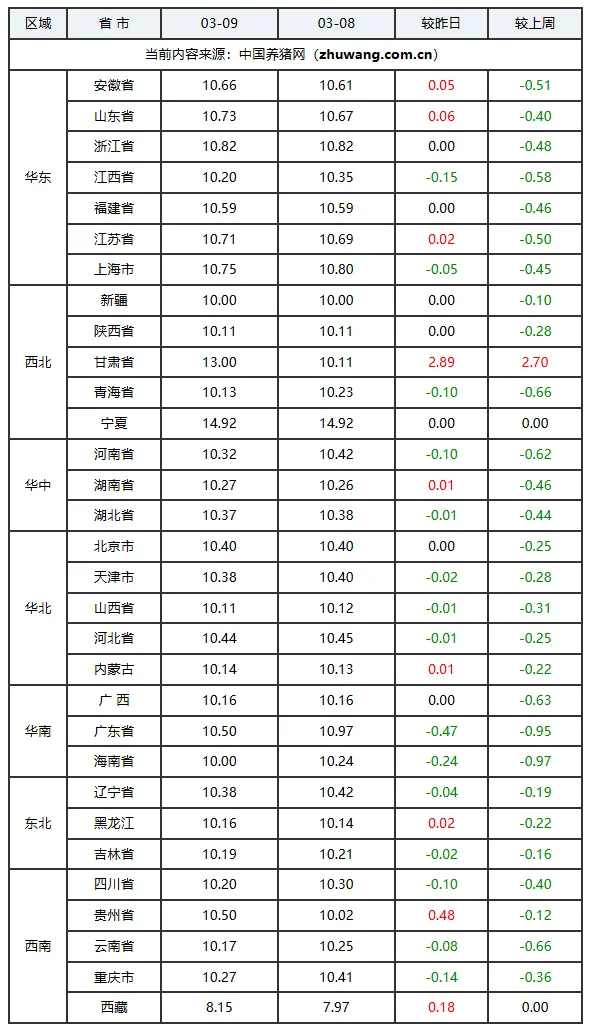 猪价上涨地区(9个):安徽省、山东省、江苏省、甘肃省、湖南省、内蒙古自治区、贵州省、西藏自治区、黑龙江省;上涨区间:0.01-2.89元/公斤; 猪价持平地区(7个):浙江省、广西壮族自治区、福建省、新疆维吾尔自治区、陕西省、宁夏回族自治区、北京市; 猪价下跌地区(15个):江西省、青海省、辽宁省、重庆市、山西省、海南省、广东省、河北省、河南省、天津市、湖北省、吉林省、云南省、上海市、四川省;下跌区间:0.01-0.47元/公斤; 2026年03月10日-中国养猪网 玄田算法预测明日猪价