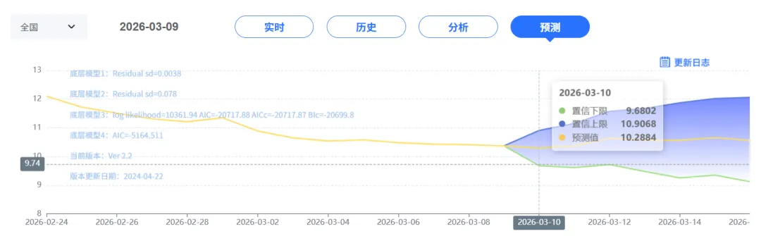 玄田算法是由项目课题组团队原创的非经典逻辑数值聚合理论和不确定性预测方法,构建了基于一致模算子的生猪价格预测模型。该模型采用的聚合函数及一致模相关理论与方法已获得多项国家自然科学基金和省级自然科学资金资助,并获得多项省级自然科学奖奖项。03月10日预测猪价为10.2884,置信区间在9.6802--10.9068之间。03月11日预测猪价为10.3687;03月12日预测猪价为10.6359。