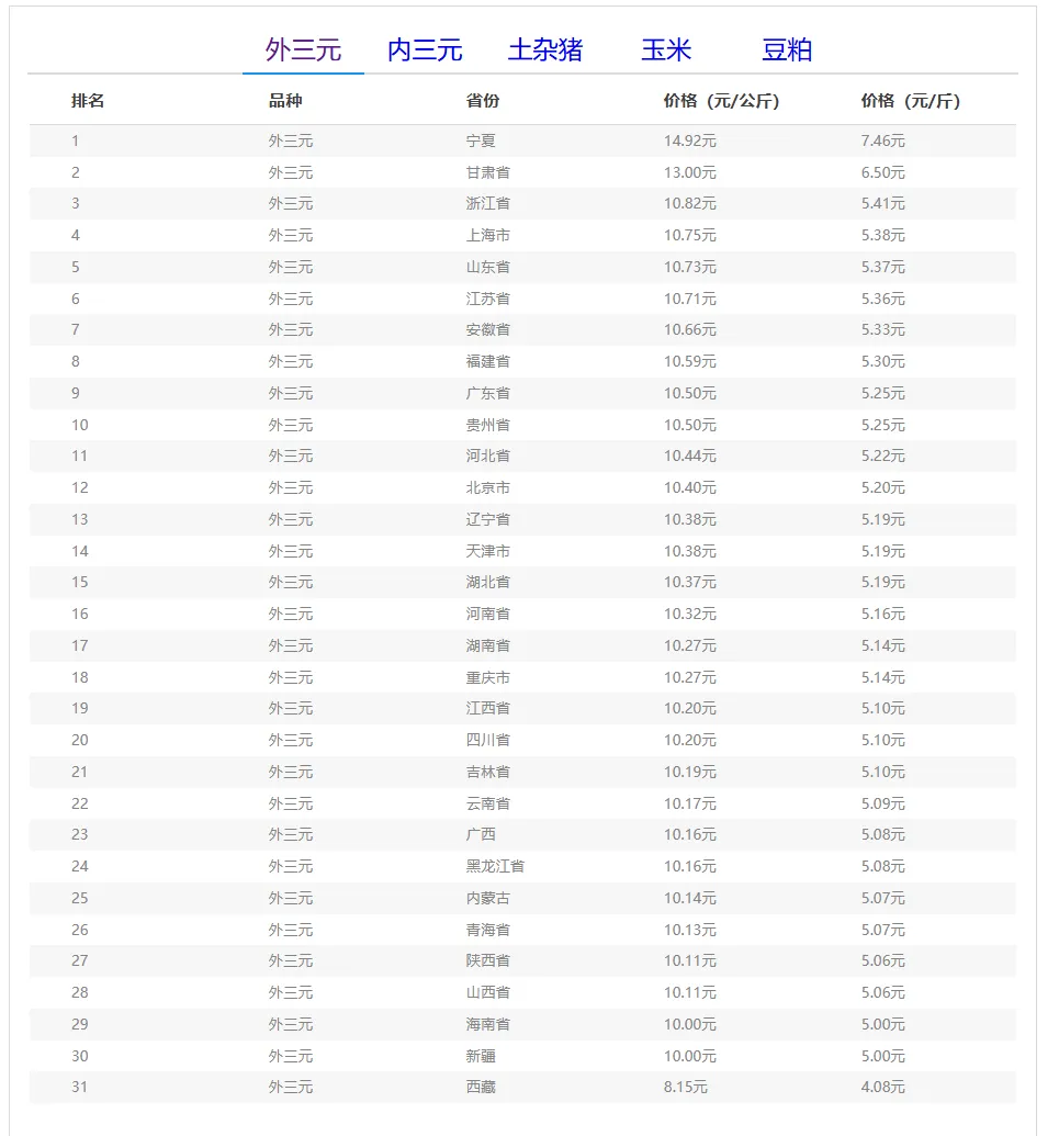 外三元排行前三:宁夏回族自治区14.92元/公斤、甘肃省13.00元/公斤、浙江省10.82元/公斤;