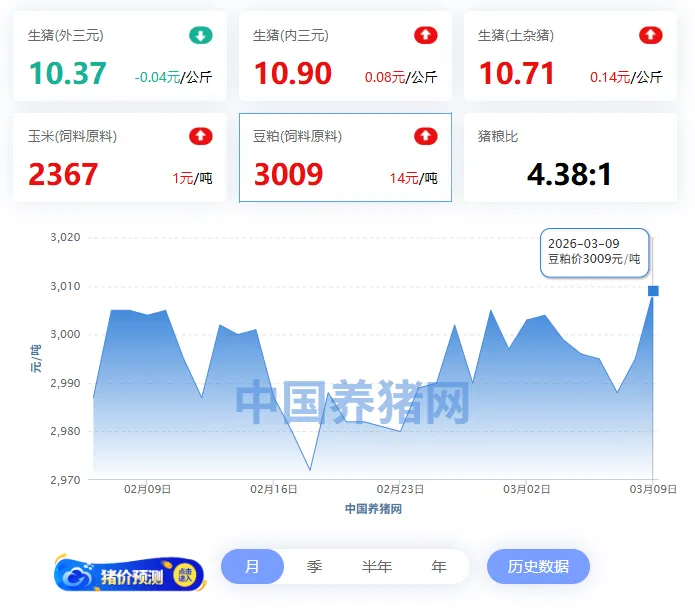 2026年03月09日-中国养猪网 全国豆粕价格走势图及涨跌表