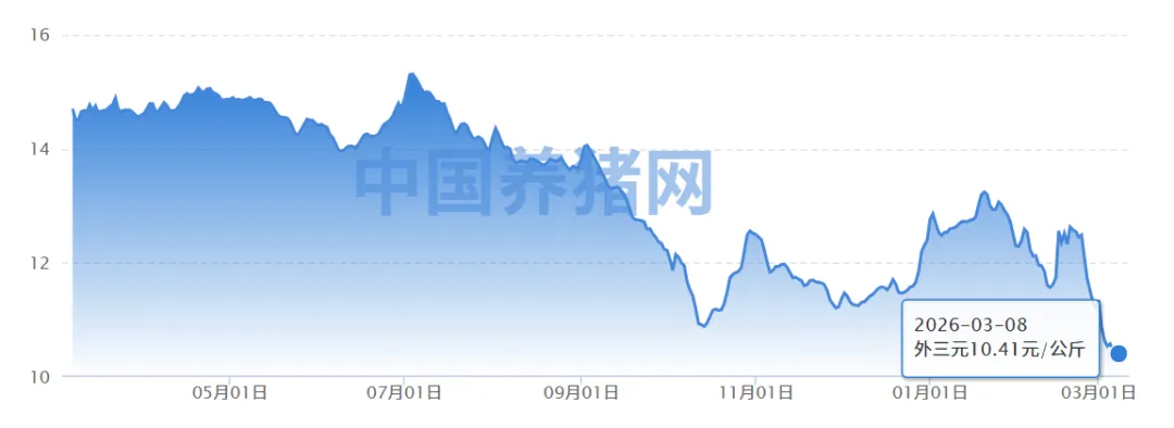 如图,今天生猪外三元均价达近一年心底,10.41元。