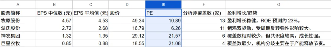 如图,看估值,平均约15倍,最低的温氏股份6.3倍,最高的神农集团21.6倍。中位数和平均数相近,说明预期较为一致。但15倍的绝对值看,不贵,但也不便宜。