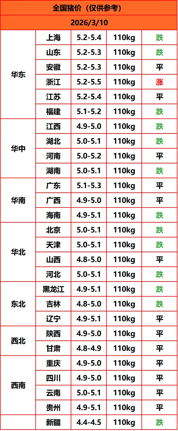 猪价上涨乏力!3月10日最新明日猪价!【2026/3/10周二】 养羊网 2026-03-09 猪价上涨乏力!3月10日最新明日猪价!【2026/3/10周二】点击下方?和关注,为您推荐更多猪价信息2026年3月10日猪价明日全国猪价行情走势1涨13平13跌? 养羊网 2026-03-09 上一篇:【明日猪价】3月10日(猪价变脸,涨涨涨完了!全国猪价最新报价!) 下一篇:【今日猪价】3月9日全国最新猪价(已更新) 您可能还会对下面的文章感兴趣111: 相关文章 2026.1.9鸡蛋价格早报 NSK能买到这么便宜的鸡蛋!! 近期价格更新!!! 2025年4月13日全国各地生猪价格信息