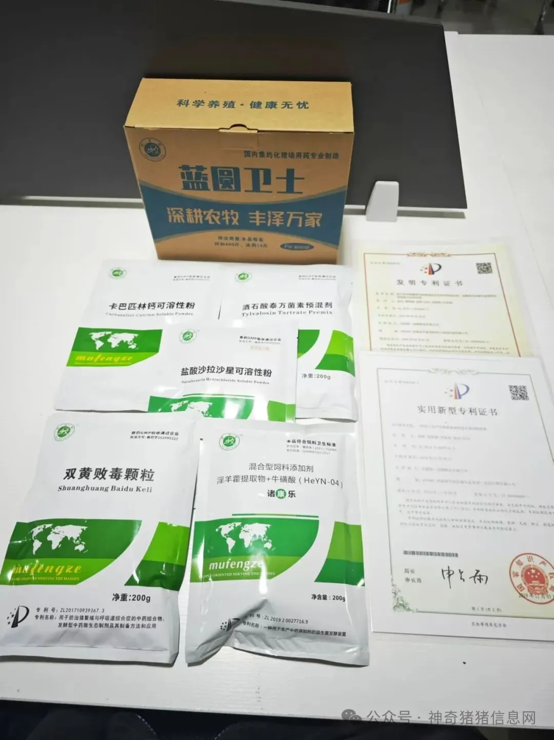 专利配方双黄败毒颗粒、酒石酸泰万菌素、盐酸沙拉沙星可溶性粉,卡巴匹林钙可溶性粉、诸康乐。