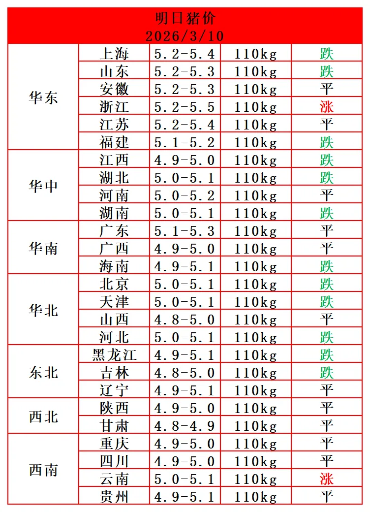 2026-3-10日猪价(明日猪价) 养羊网 2026-03-09 2026-3-10日猪价(明日猪价)立马收到明日猪价! 养羊网 2026-03-09 上一篇:【猪价预测】2026年3月11日至3月13日!全国猪价! 下一篇:【猪价预测】2026年3月11日 ~3月13日!全国猪价! 您可能还会对下面的文章感兴趣111: 相关文章 猪猪?的春天要来了 广东电商课程培训? 0 基础小白的逆袭路 猪价跌破11.6元,腌腊季为何还救不了市场? 自家养殖,出超级健康的小羊?