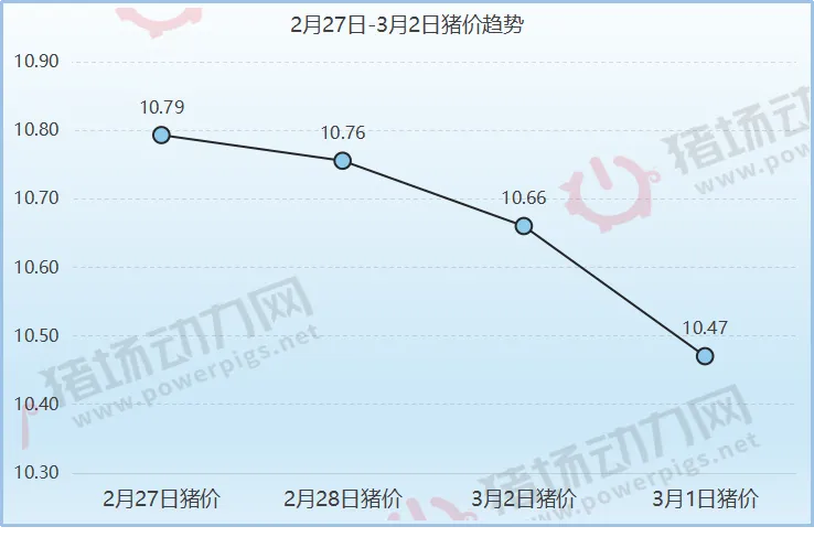 春节后,猪价迎来了一波迅速下跌,期间曾有两天短暂的止跌回调,但马上又再次探底,全国有28个省份维持在“5元区间”已经超过一周以上。据猪场动力网统计,3月2日全国120公斤-130公斤标准体重生猪平均价格为10.47元/公斤,一日之内下跌近2毛。