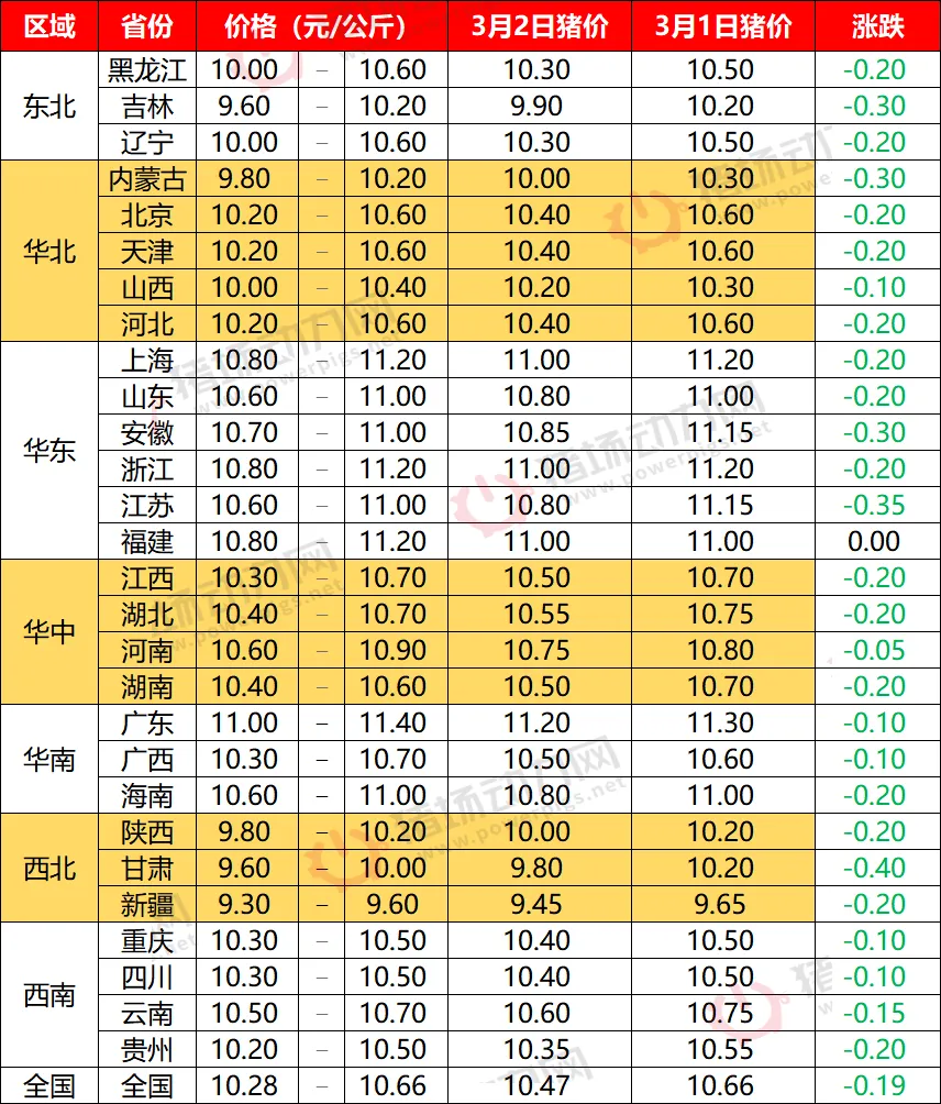 3月2日全国猪价全面下跌,有地区跌进4元【动力猪价】