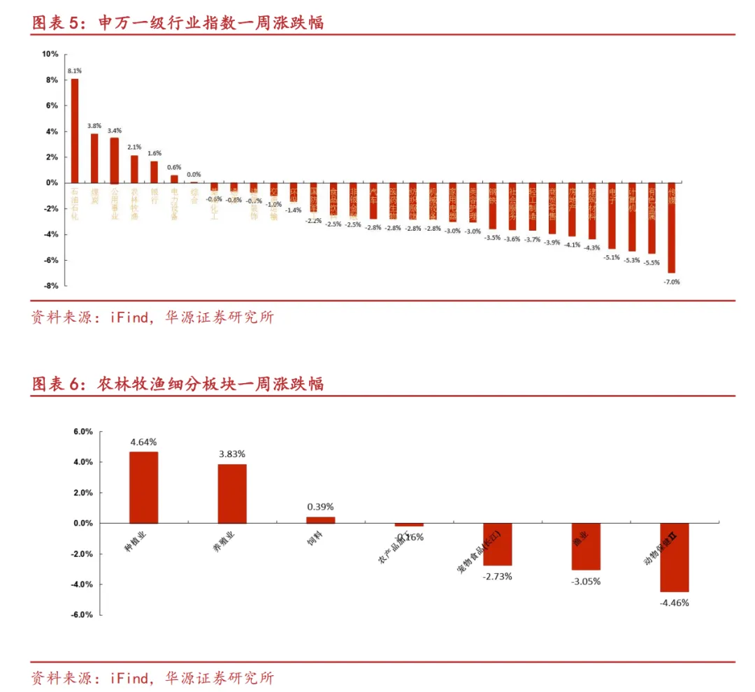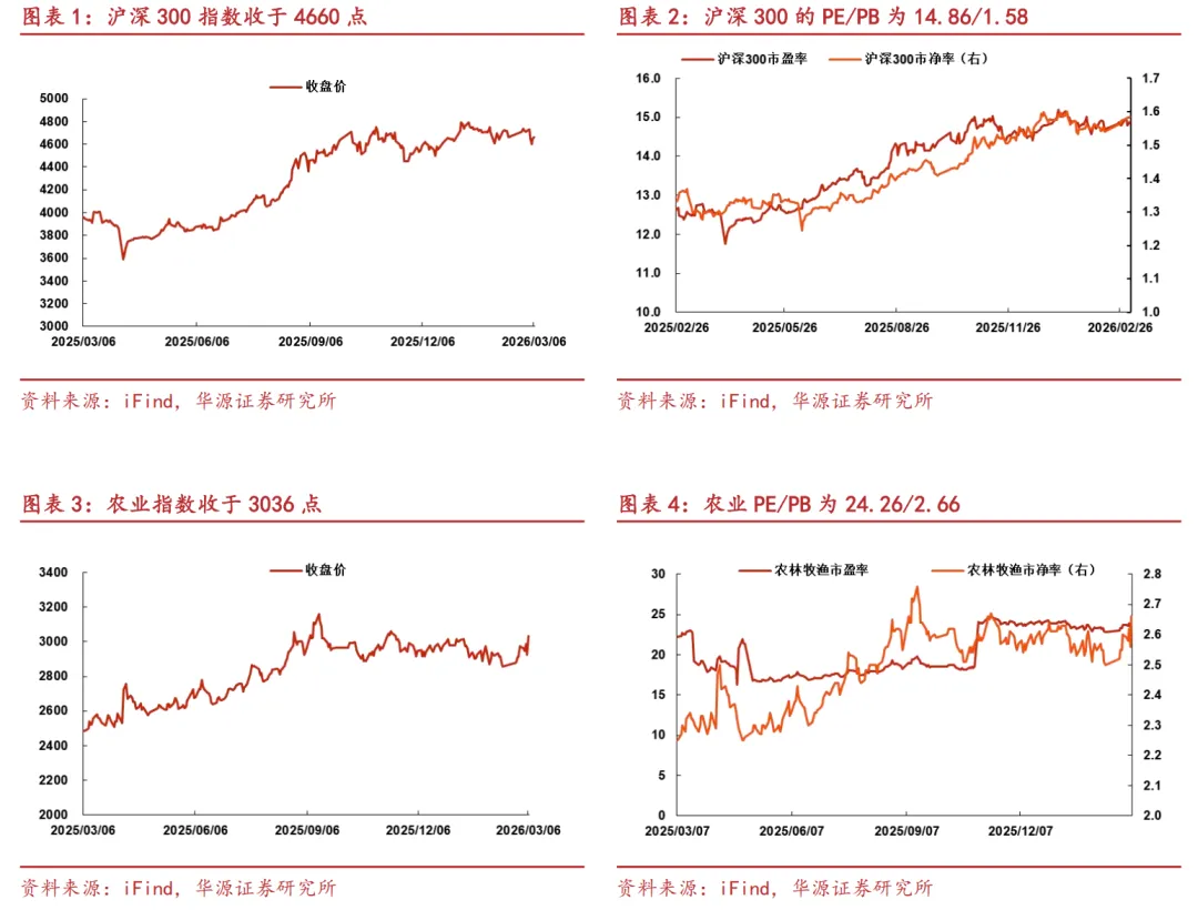 本周(3.02-3.06)沪深300指数收于4660,相比上周-1.07%。农林牧渔II(申万)指数收于3036,相比上周+2.12%,其中种植业(+4.64%)表现最好。