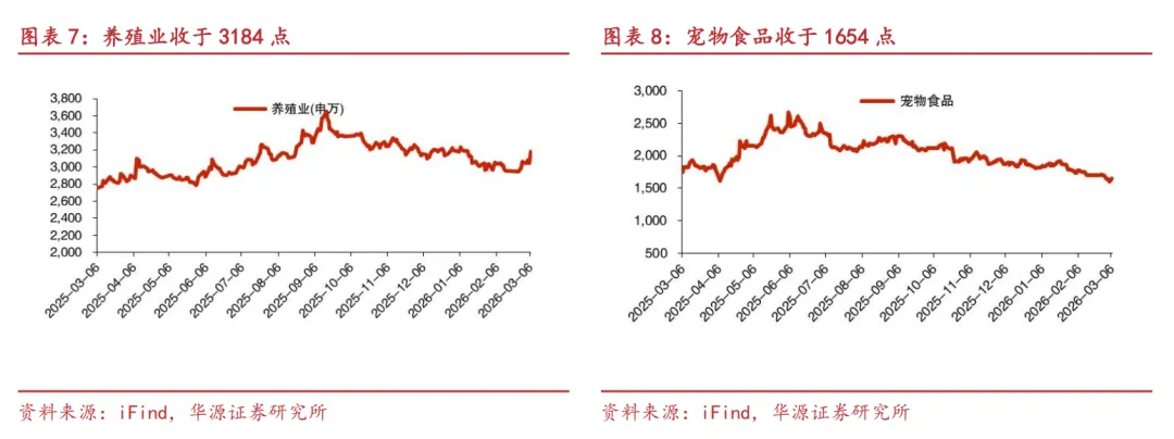 板块本周整体回暖。3月8日毛鸡价格3.5元/斤,环比+1.4%,同比+5.0%,鸡苗报价3.0元/羽,环比持平,同比+11%。受法国主要供种地区禽流感事件影响,法国或全面暂停对中国出口种鸡,2025年国内祖代种鸡更新来源中法国引种占40%,其余几乎均为国内自繁,法国疫情或致进口引种进一步减少甚至暂停,父母代种苗价格有望高位上行。