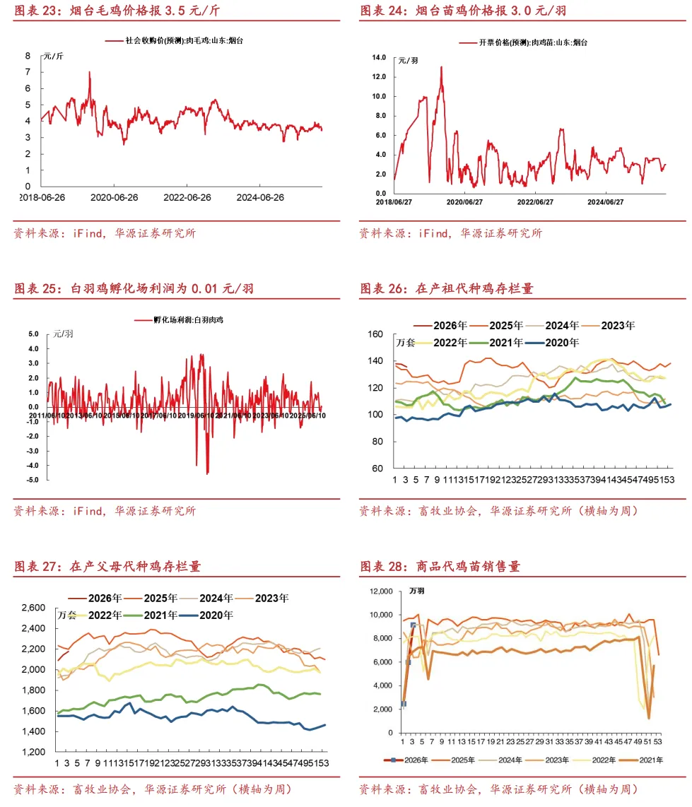 2026年白羽鸡行业“高产能、弱消费”矛盾持续,亏损倒逼种鸡场缩减产能,产业链一体化企业以及合同订单养殖企业或进一步扩大市占率,2026年龙头优势或持续。