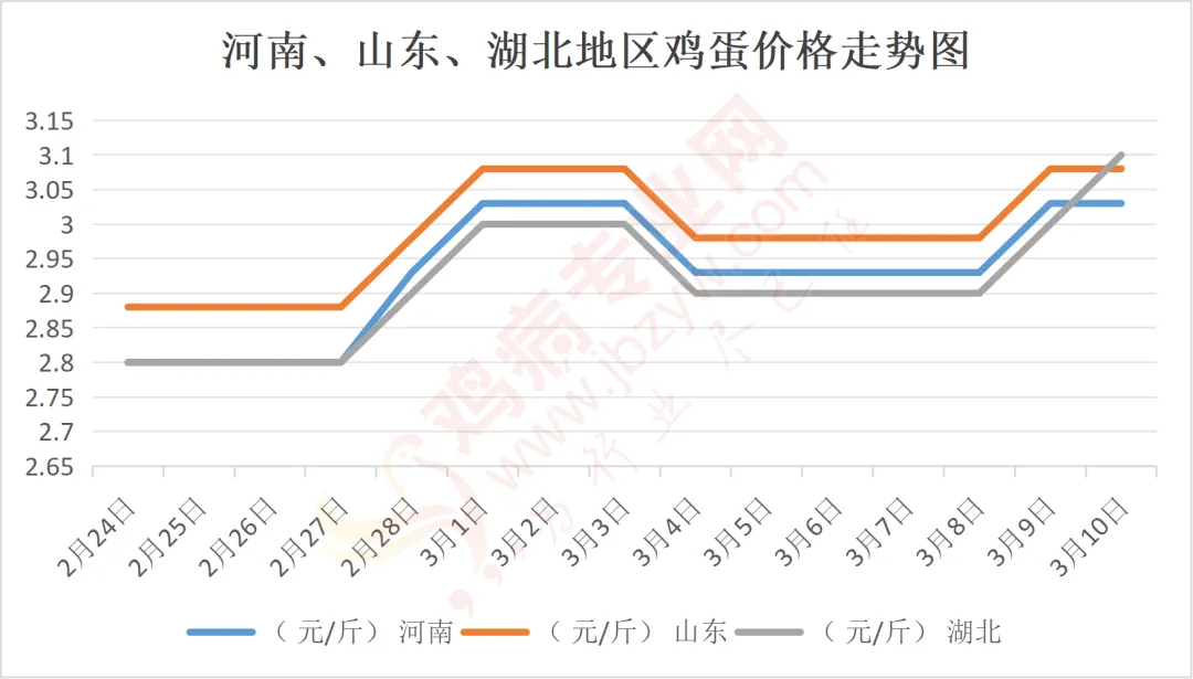 10.今日全国主流价格有涨有稳,今日东北辽宁价格上涨、吉林价格稳定,黑龙江蛋价上涨,山西价格以涨为主、河北价格以涨为主;山东主流价格多数稳定,河南蛋价格稳定,湖北褐蛋价格稳、江苏、安徽价格以稳为主,局部鸡蛋价格有高低,蛋价继续震荡盘整 ,走货正常。