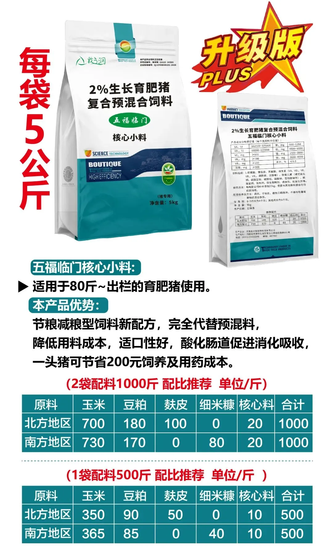 这是一款节粮减粮型饲料新配方,是能抗病、促消化、祛霉变、防非、能催肥、能降成本的自配核心料。五福临门核心小料里面有大量的酸制剂,促消化制剂,这些成分是自带催肥助消化成功能的,能够有效的代替催肥产品,促进肥猪增肥增重,诱食剂,酶制剂能够开胃健脾,抑制肠道有害菌,提高采食,防止拉稀;能够代替部分催肥产品、多维产品、脱霉剂的使用!长期添加一头猪能够省下260块钱左右的饲养成本!