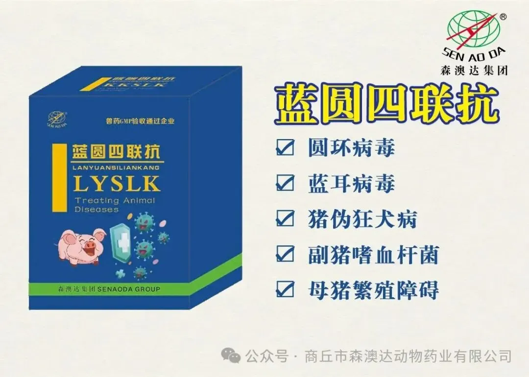 森澳达“黄金组合”,轻松净化蓝耳圆环! 森澳达深耕养殖行业24年,早就摸透了蓝耳圆环的套路,推出?蓝圆四联抗+姆康源?净化组合,双管齐下,一边控病毒,一边修身体,猪场稳得很! 控病毒神器:蓝圆四联抗