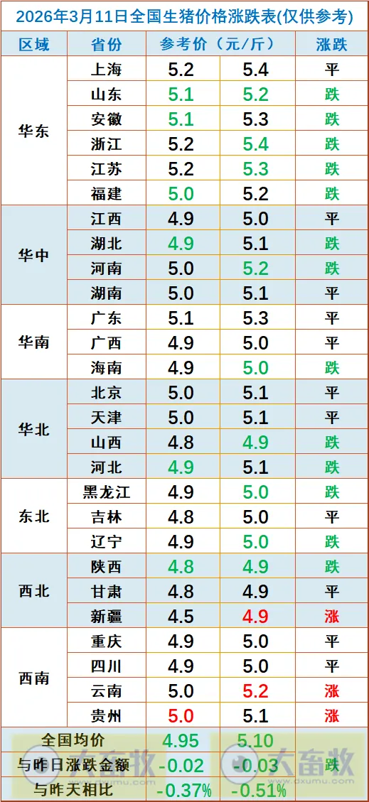 大畜牧小编根据我国27省的猪价数据,计算出2026年3月11日全国平均猪价为每斤5.03元,比昨天下跌0.02元,跌幅为0.44%,不仅是今年以来最低价,也是连续4天创下2019年以来最低;