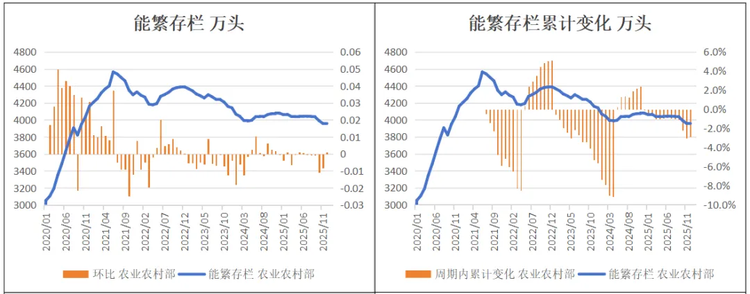 2025年12月,农业农村部能繁存栏3961万头,环比+4万头,同比-2.9%,本轮产能去化周期(从24年12月开始)能繁存栏累计减少2.9%,前期去化缓慢,10月开始去化加速,但去化程度仍不够。