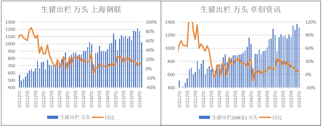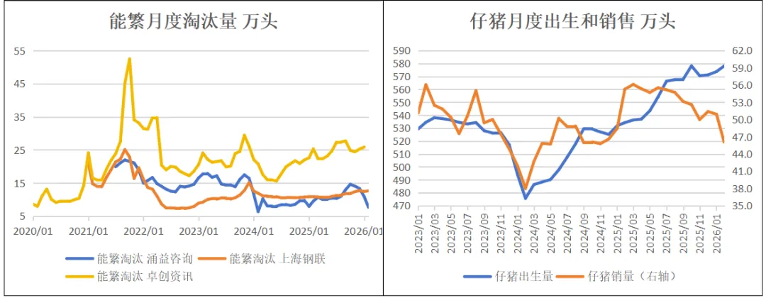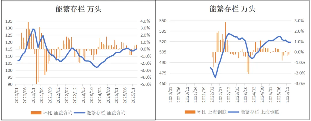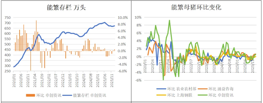 2026年1月,涌益咨询/上海钢联/卓创资讯能繁存栏环比+0.5%、+0%、+0.5%。