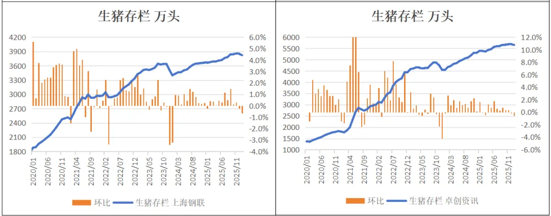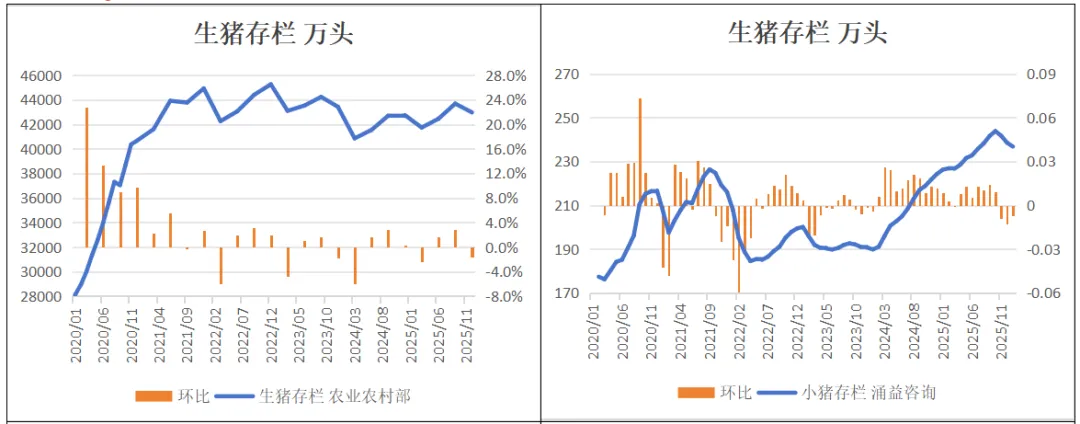 2026年1月,涌益咨询/上海钢联/卓创资讯生猪存栏环比-0.7%、-2.2%、-0.7%。