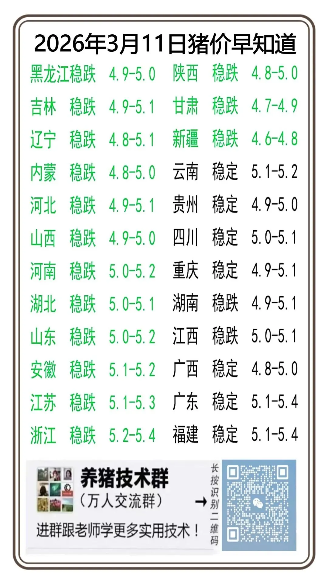 猪价继续下跌!!2026年3月11日多省猪价继续下跌!! 养羊网 2026-03-10 猪价继续下跌!!2026年3月11日多省猪价继续下跌!! 养羊网 2026-03-10 上一篇:猪价跌到底了!下一步猪价或将触底反弹,迎来上涨行情 下一篇:猪价行情(2026.3.11)︱仅供参考 您可能还会对下面的文章感兴趣111: 相关文章 15一碗的羊杂汤,东北是有自己的价格体系吗 近期价格更新!!! 12.16鸡蛋销售价格 2026.1.19-明天猪价(涨翻了天!)