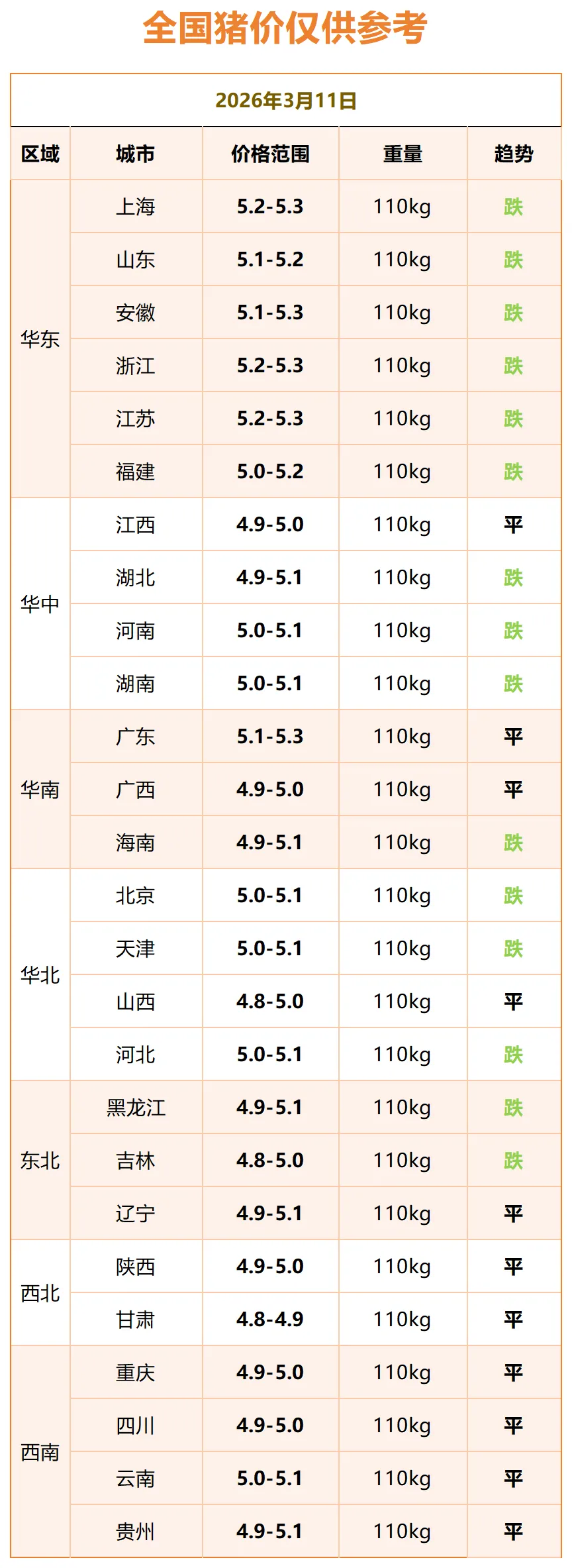 明日猪价早知道~全国大部分地区猪价持平,小部分地区的猪价下跌! 养羊网 2026-03-11 明日猪价早知道~全国大部分地区猪价持平,小部分地区的猪价下跌!猪价播报2026年3月11日全国猪价播报全国猪价播报~END~长按识别二维码关注我们 养羊网 2026-03-11 上一篇:明日猪价(2026年03月11日) 下一篇:明天2026.3.11日鸡蛋价格预测 您可能还会对下面的文章感兴趣111: 相关文章 网购活羊遇骗局?语音会议藏诈骗?来看陷阱 【菁华农牧】2月27日猪价信息 中农网周报价(24.8.5-24.8.11) 【明日猪价】2026-1-22全国生猪价格(猪价大范围下跌)