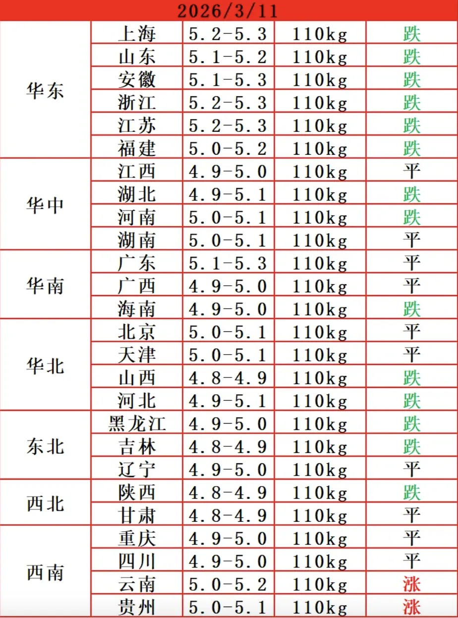 上涨的地区:今天虽然市场情绪持续偏弱,但依然有个别涨价的情况出现,像云南和贵州这两个地区涨价;