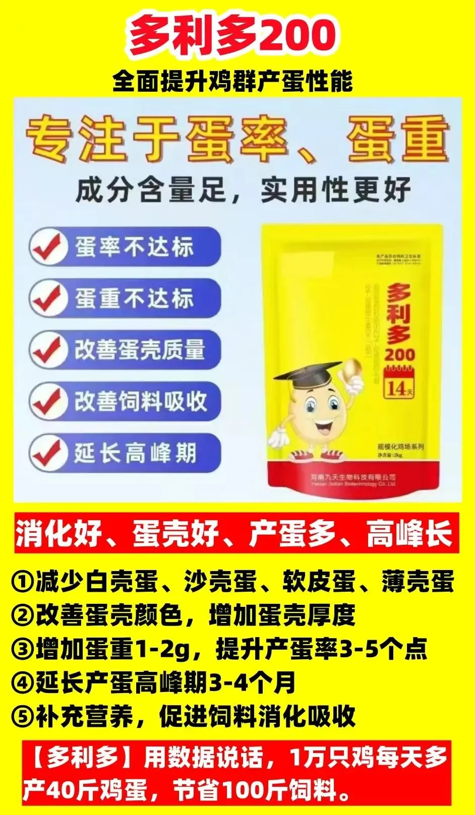 【多利多200】内补气血,滋养卵巢,强肝护肾,调理肠道,全面提升鸡群产蛋性能。蛋壳差、蛋率低、蛋重小、高峰短,料蛋比高,全部搞定。不用再额外添加(多维、鱼肝油、益生菌、增蛋药、保肝护肾产品),肠炎和输卵管炎减少80%以上。