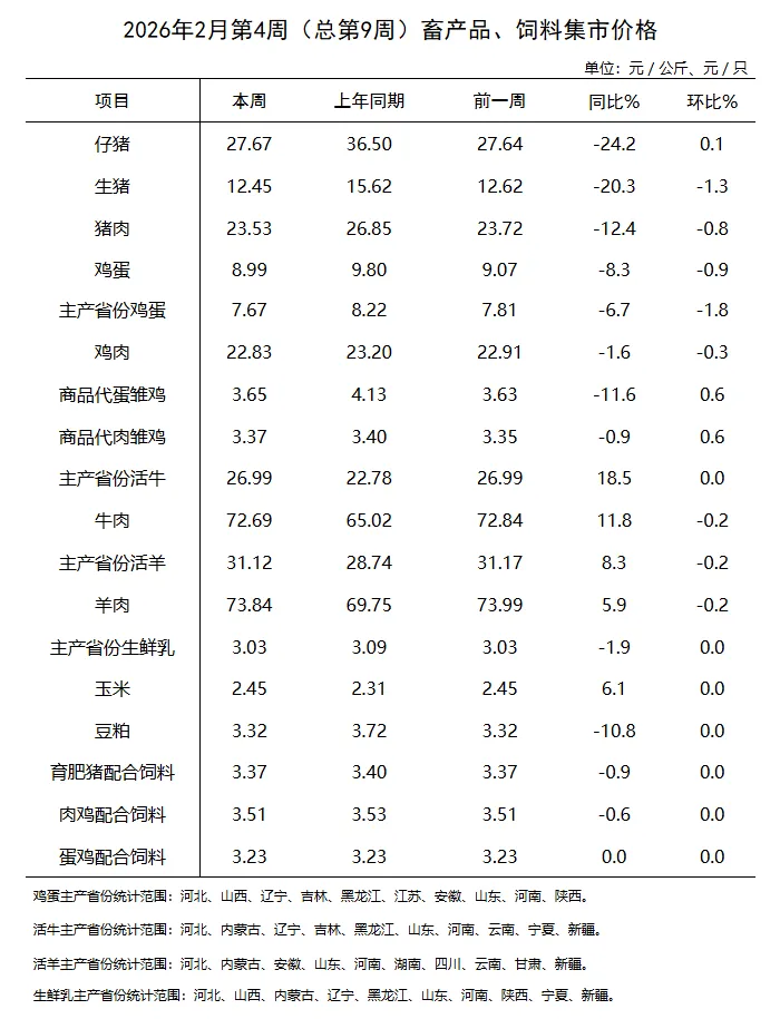 3月3日,农业农村部畜牧兽医局发布2月第4周(采集日为2月26日)畜产品和饲料集贸市场价格情况。当周,仔猪价格环比上涨,生猪、猪肉价格环比下跌,饲料产品价格环比持平。