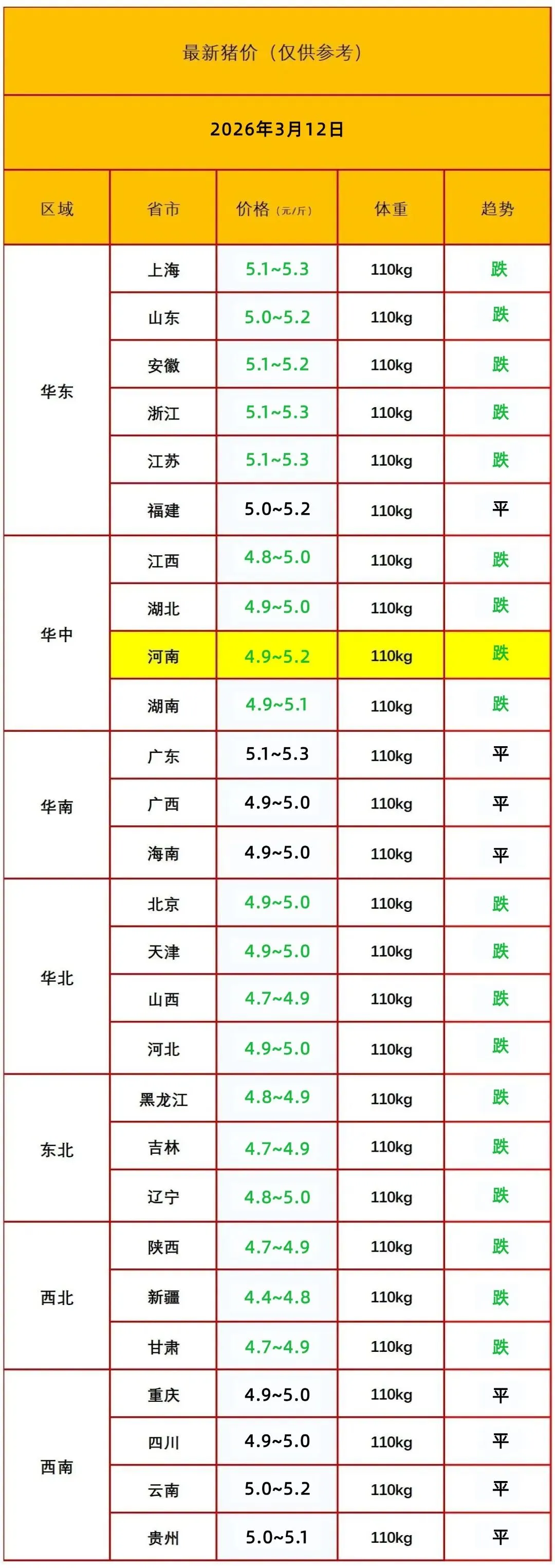 北弱南稳延续,深亏磨底未改 2026 年 3 月 12 日全国猪价弱势震荡、北弱南稳,外三元生猪均价报10.06 元 / 公斤(5.03 元 / 斤),较前一日小幅下跌。北方主产区普遍走弱,东北、华北、西北多地跌破 5 元 / 斤;南方以稳为主,华南、西南局部抗跌,全国价差维持在 1.0 元 / 斤左右,行业仍处深度亏损区间。