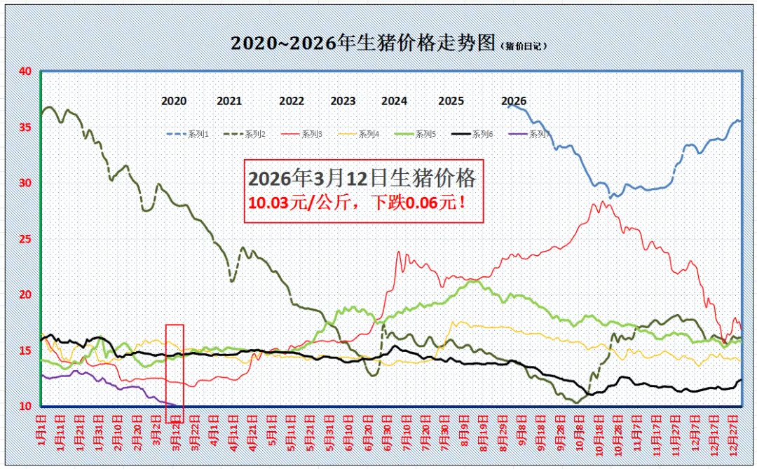 2026.3.12-明天猪价时光荏苒,3月即将过半,国内生猪市场,近期,猪价陷入“磨底”的泥潭,虽然,市场底部支撑陆续显现,但是,碍于生猪供需延续“供过于求”的基本面,猪价在震荡中持续走低,国内标猪报价即将跌破5元/斤的重要关口,市场情绪悲观情绪弥漫,短暂猪价仍以震荡下行为主。但是,倘若,猪价跌破5元/斤的关口,这或将刺激市场抄底情绪反扑,猪价仍存“由跌转涨”的机会! 从机构调研了解,目前,受屠宰场去年持续亏损,今年冻品库存同比偏少1~2成,主流屠宰场多以滚动操作为主,积极清理6个月以上的库存,而重新分割入库情绪不高,多地屠宰场以被动入库为主!目前,屠宰场逢低抄底情绪一般,观望心态偏强。 在二次育肥方面,当前,标猪价格降至近6年以来最低,标猪均价徘徊在5元/斤,理论来看,二育存在积极入场的契机!但是,实际反馈,二育情绪极为克制,主要受去年猪价旺季不旺,主流二育面临较为严峻的亏损,今年二育对于猪价前景信心不足,观望情绪为主!不过,倘若,接下来猪价重心进一步下降,标猪跌破5元/斤后,二育仍有集中入场的操作! 在饲料成本方面,目前,主流养殖主体仔猪育肥至120公斤左右,全程成本在6元/斤左右。当前,标猪均价仅有5元/斤上下,生猪产业面进入亏损阶段,而近期玉米价格不断走高,豆粕行情也逆势上涨,这进一步增加养殖压力! 因此,基于市场多方因素,目前,二育以及屠宰场分割入库缺乏入场积极性,二育受育肥成本以及标肥价差倒挂谨慎心态较强,国内生猪购销仍以基本面为主! 由于本月集团猪企出栏计划大幅增加,且,压栏亏损压力进一步加大,主流散户以及集团猪企多维持正常出栏节奏,集团猪企减重增量出栏现象较多,社会面猪场多跟风抛售,生猪供应整体宽松。而需求方面,猪肉购销进入季节性低谷,且,内销市场需求惨淡,虽然,城市需求略有回升,但是,整体白条购销不佳,屠宰场缺乏订单增量,市场对于猪源承接略显不足! 因此,在供需博弈下,受屠宰场调价,预计,3月12日,外三元瘦肉型标猪价格出栏均价在10.03元/公斤,后市关注集团猪企出栏节奏的变化。