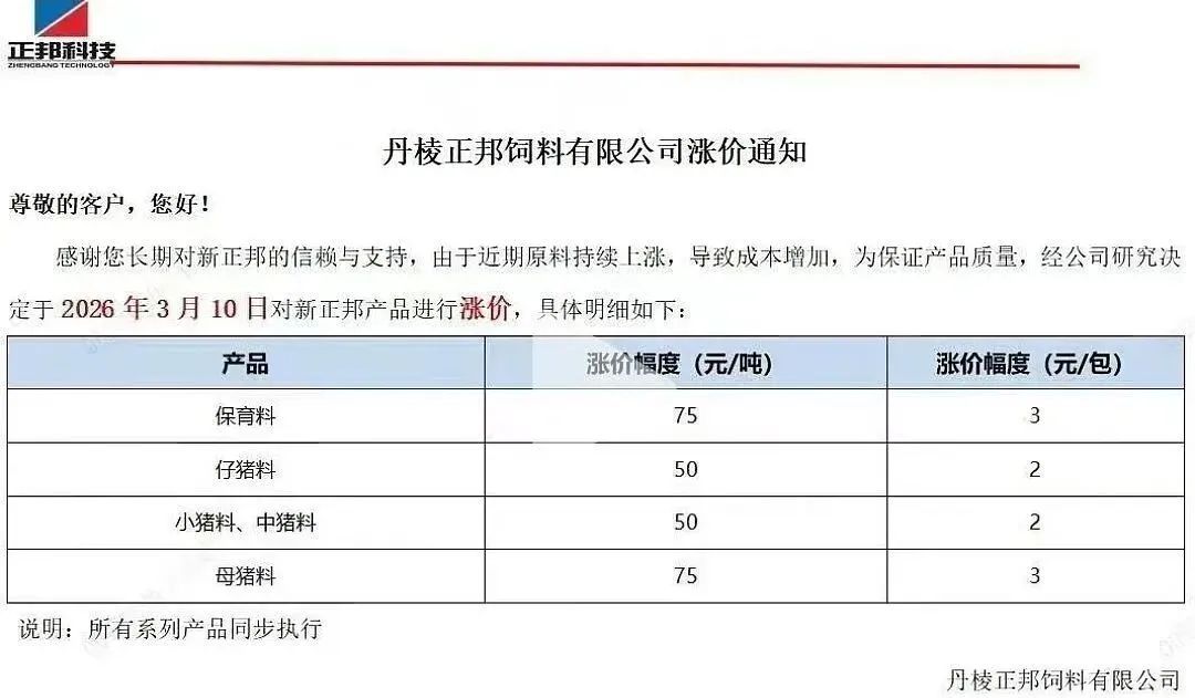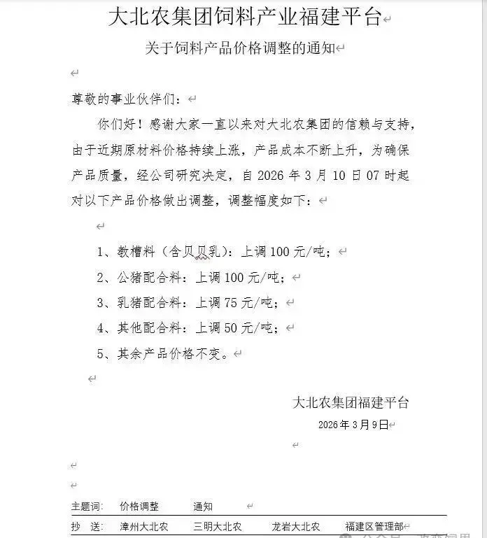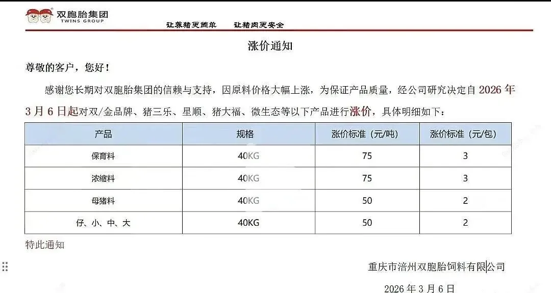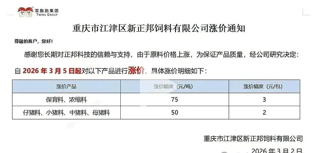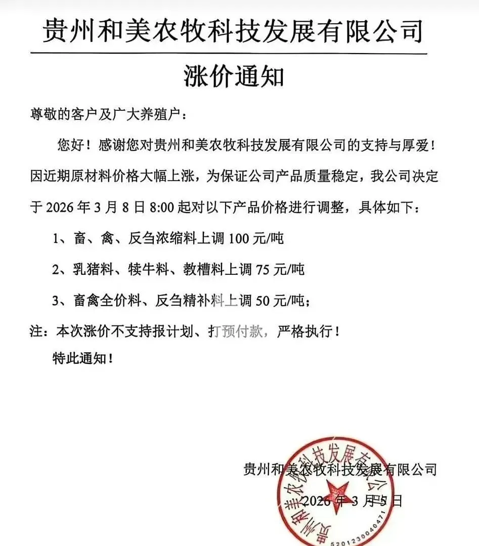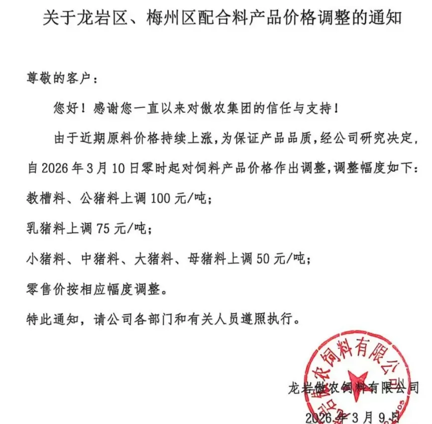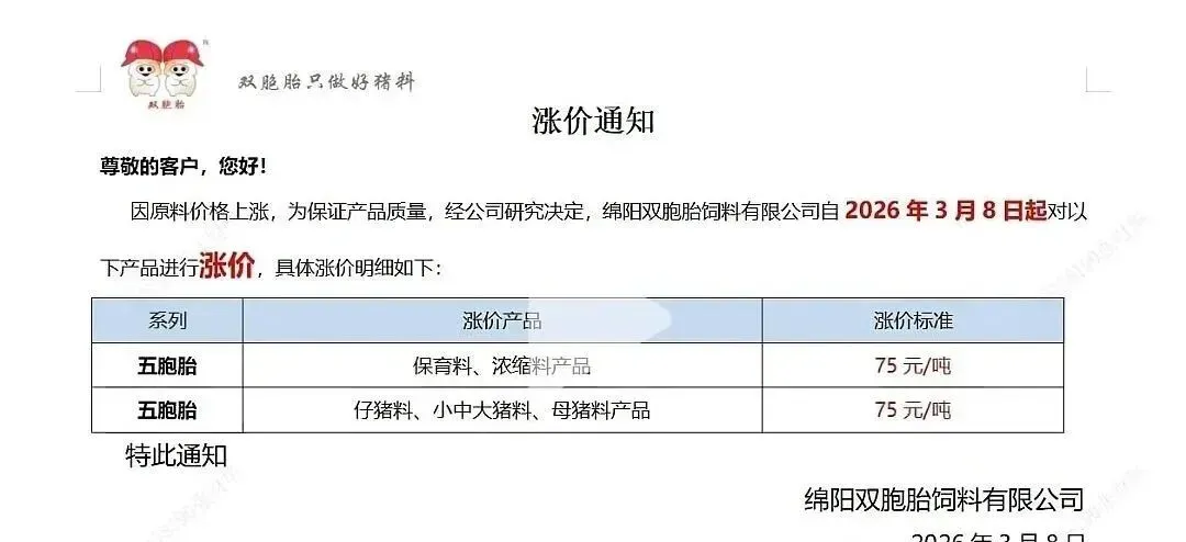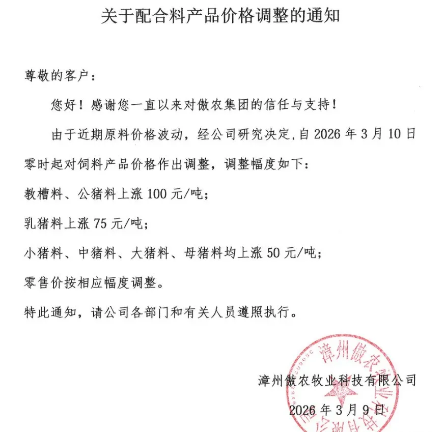 “3月10日起,各类猪料价格全线上调。”近日,又一轮饲料涨价通知密集发布。从海大、新希望到双胞胎、铁骑力士,头部企业纷纷调价,猪用饲料普遍上涨50-100元/吨。这已是2026年开年以来的第二轮集中涨价。 与年初首轮涨价叠加,育肥猪饲料成本攀升已是定局。更让养殖户无奈的是,部分企业明确“不接受预付款”。