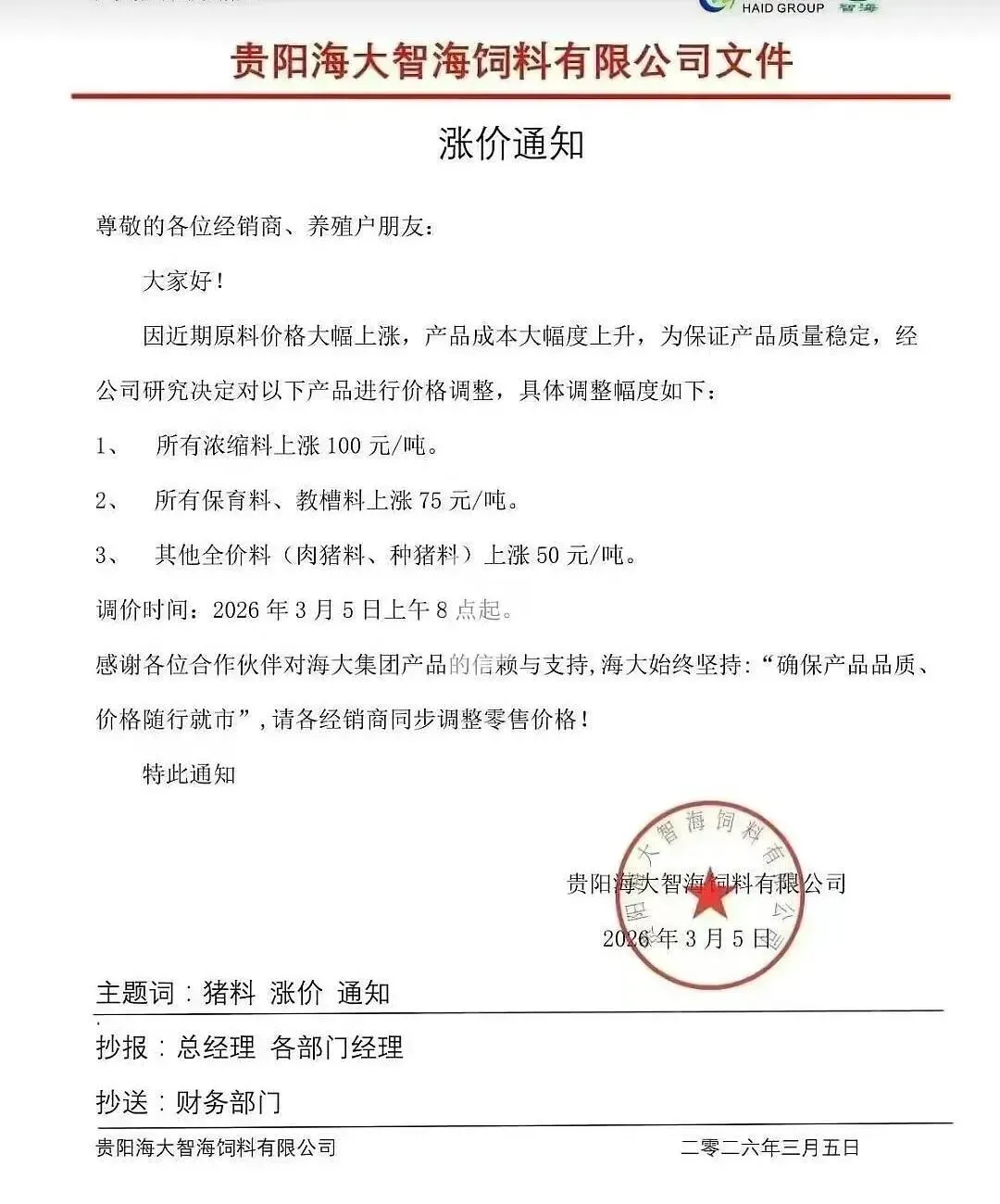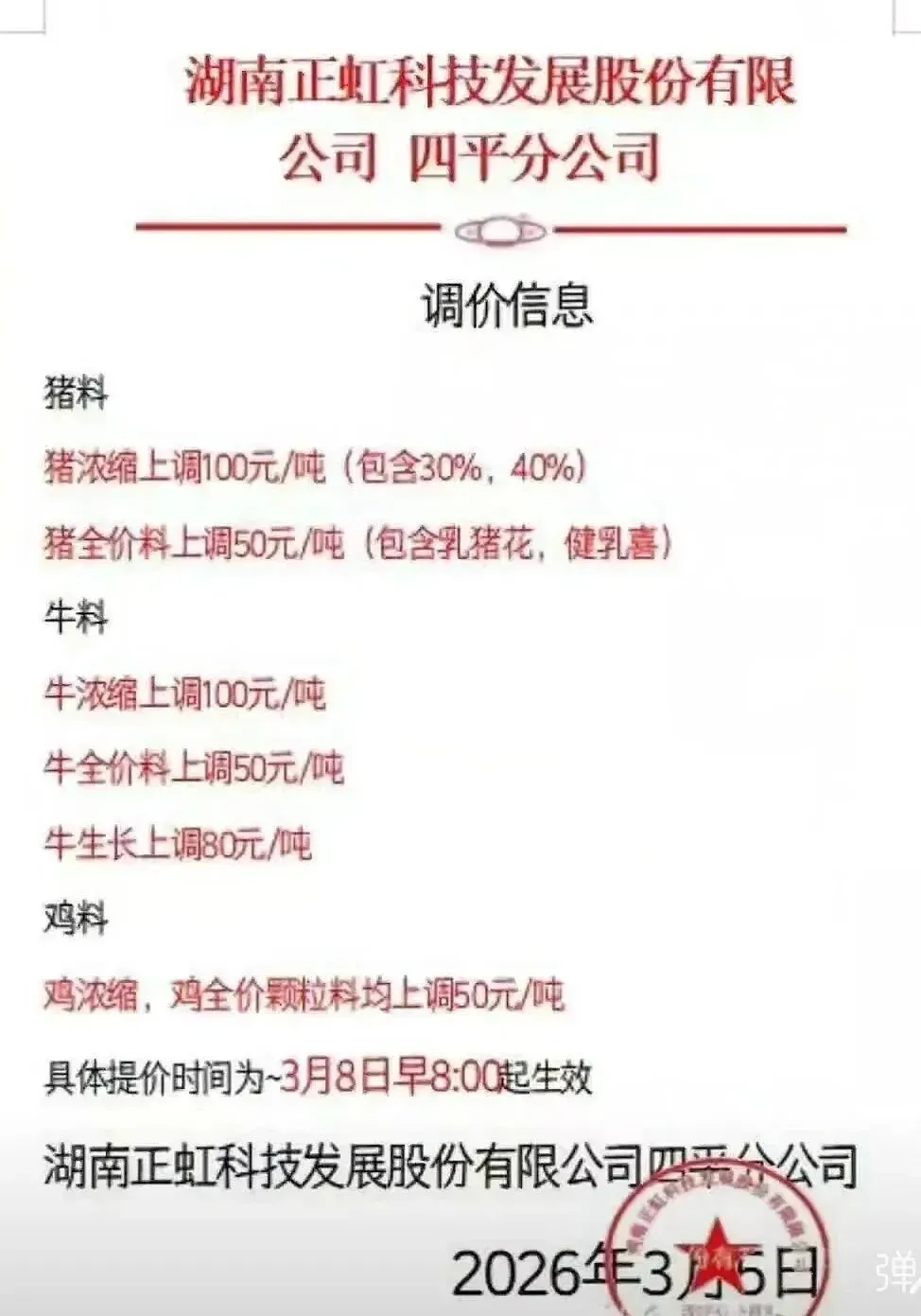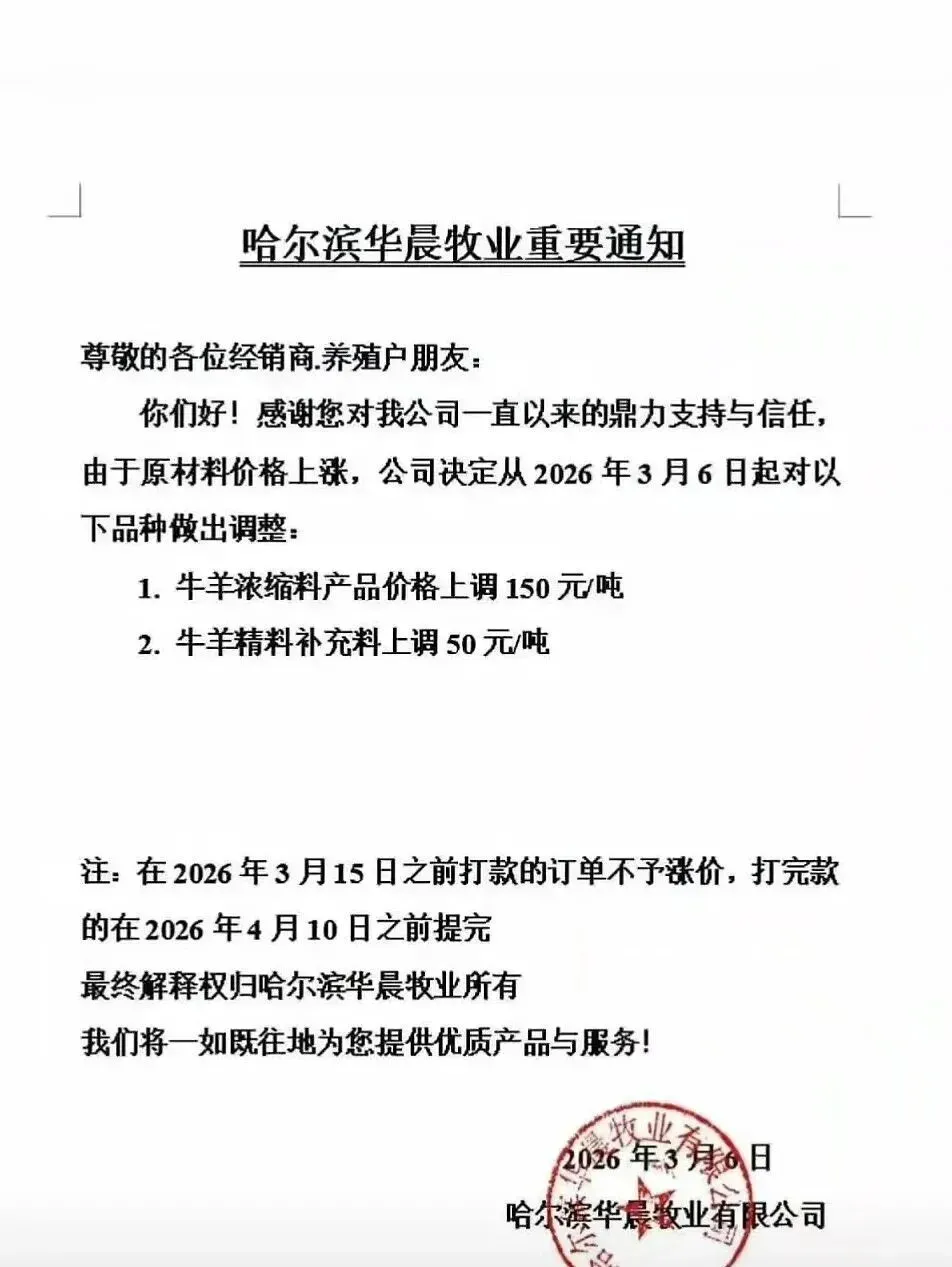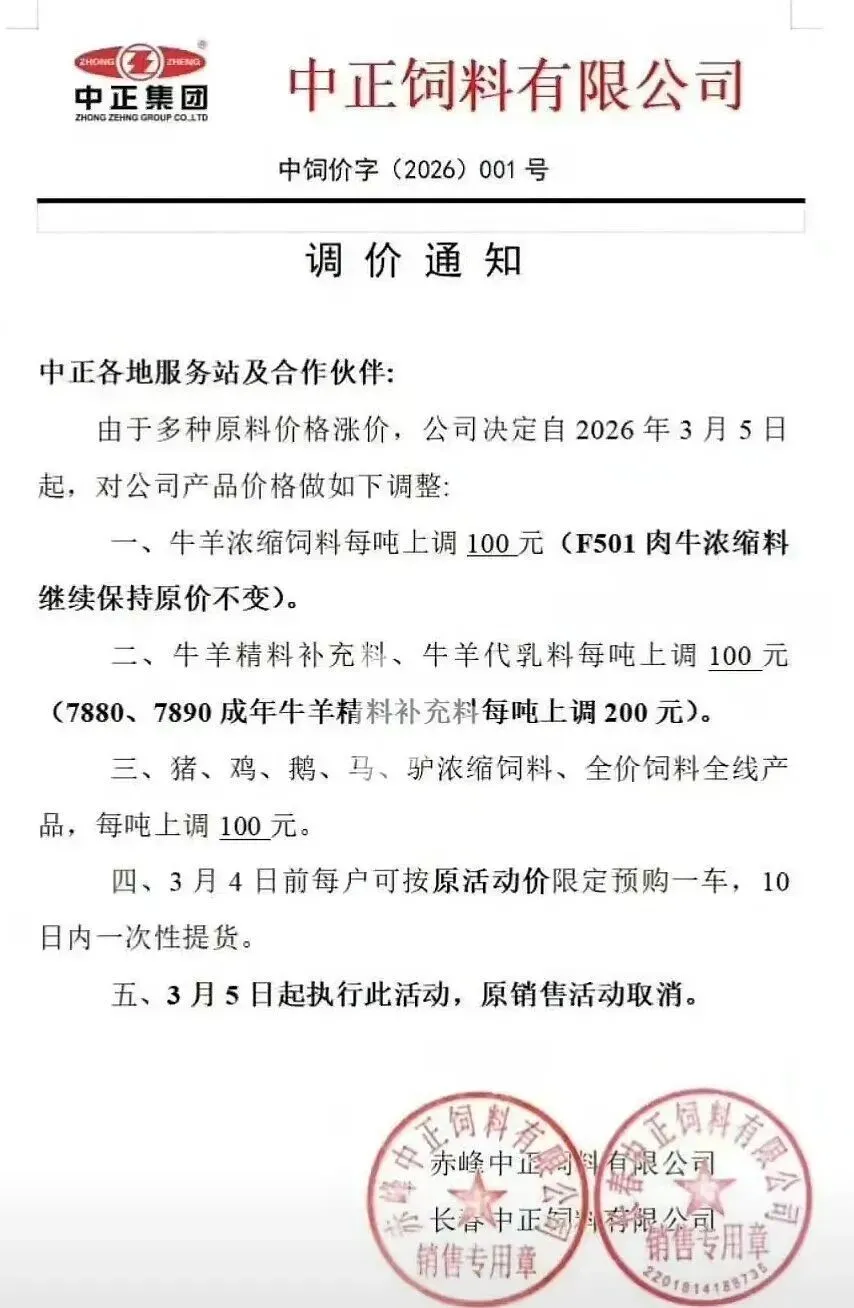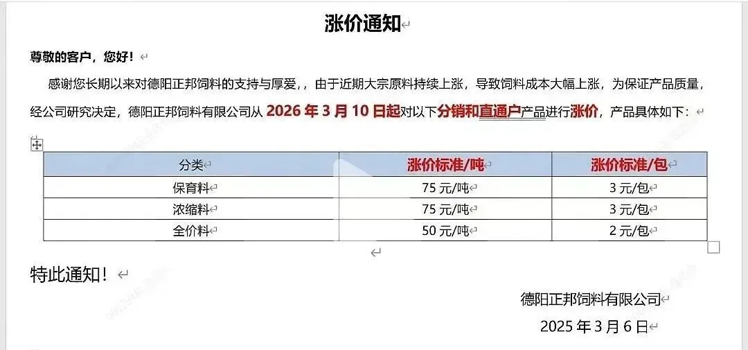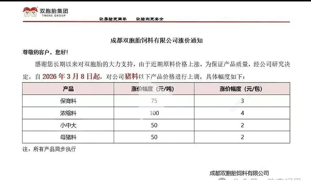 “3月10日起,各类猪料价格全线上调。”近日,又一轮饲料涨价通知密集发布。从海大、新希望到双胞胎、铁骑力士,头部企业纷纷调价,猪用饲料普遍上涨50-100元/吨。这已是2026年开年以来的第二轮集中涨价。 与年初首轮涨价叠加,育肥猪饲料成本攀升已是定局。更让养殖户无奈的是,部分企业明确“不接受预付款”。