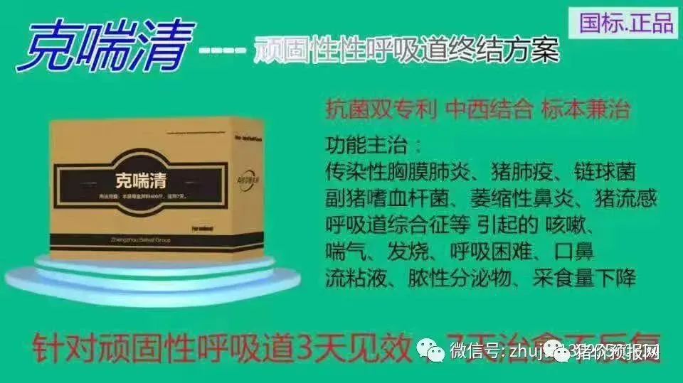 克喘清——预防和治疗传染性胸膜肺炎,副猪嗜血杆菌,巴氏杆菌,蓝耳引起的呼吸道,反复性咳喘,顽固性咳喘,久治不愈的呼吸道。可做到3天见效,5-7天痊愈彻底不反弹特效套盒?。猪场呼吸道疾病再也不花冤枉钱!