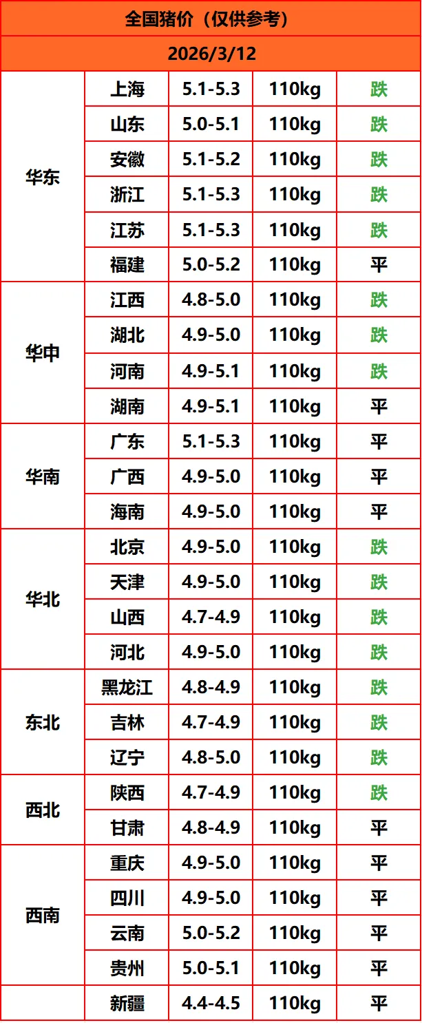 猪价无一上涨!3月12日最新明日猪价!【2026/3/12周四】