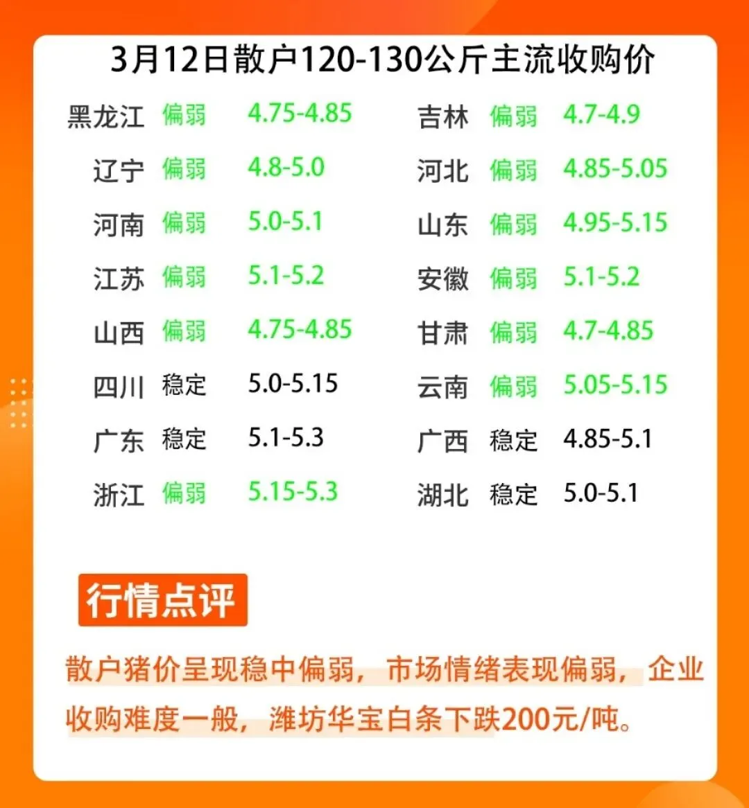 3月11日晚间猪价信息,今晚猪价情绪表现偏弱,屠宰企业采购难度一般,今晚白条猪价呈现下跌,潍坊华宝白条出场价格下跌200元/吨,预计明日北方集团猪价呈现稳中偏弱,南方地区集团猪价呈现稳中偏弱,重点关注集团猪场上猪上市量。