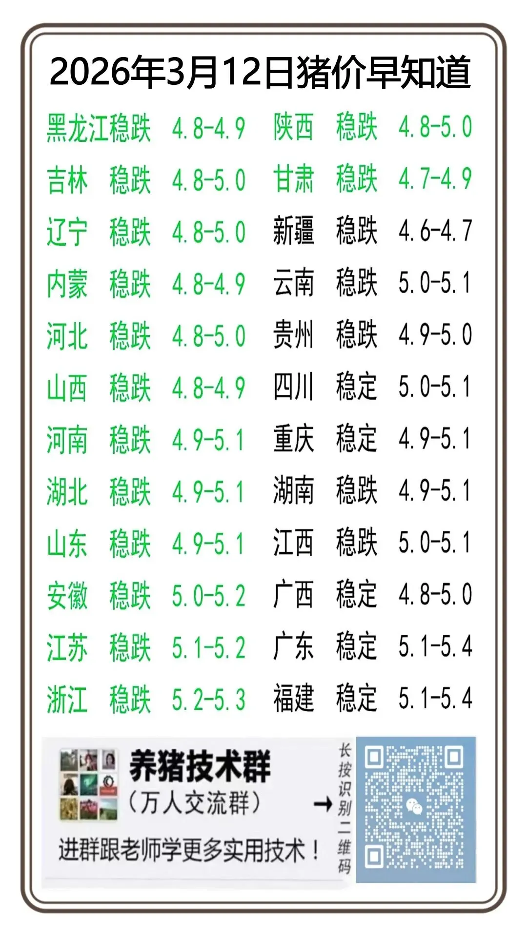 猪价进入4元时代!!2026年3月12日全国猪价继续下跌!! 养羊网 2026-03-11 猪价进入4元时代!!2026年3月12日全国猪价继续下跌!! 养羊网 2026-03-11 上一篇:蒂乐斯每日分享(生猪、毛鸡、鸡蛋价格趋势)-第260311期 下一篇:猪价跌破10元后的又一轮新周期,龙头与特色企业的全面对比与解析 您可能还会对下面的文章感兴趣111: 相关文章 阿德|这里的鸡蛋5块多 猪价突变!2026.2.8全国各地生猪价格早知道! 近期价格更新!!! 【避雷】哄抬猪价?商家因收益下降撒气顾客?