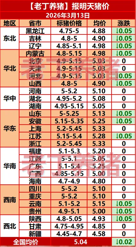 猪价来了!【明天猪价】3月13日全国猪价涨跌表!关注老丁养猪